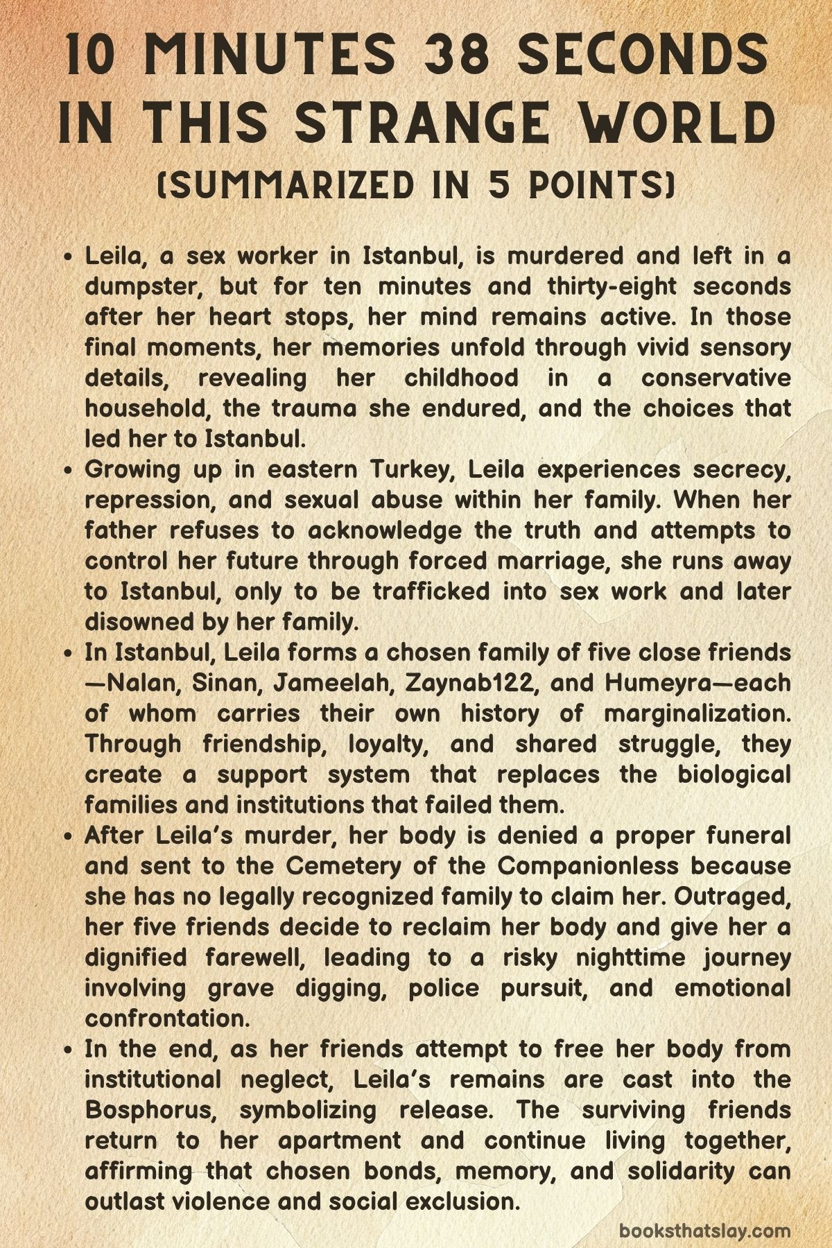 10 Minutes 38 Seconds in This Strange World by Elif Shafak is a novel set in Istanbul that begins at the instant a young woman is murdered—and then refuses to end there. As Leila’s brain keeps working for a brief time after her death, memory becomes her final shelter: tastes, scents, textures, and flashes of the life that made her “Tequila Leila” to some and simply Leila to the people who truly knew her.