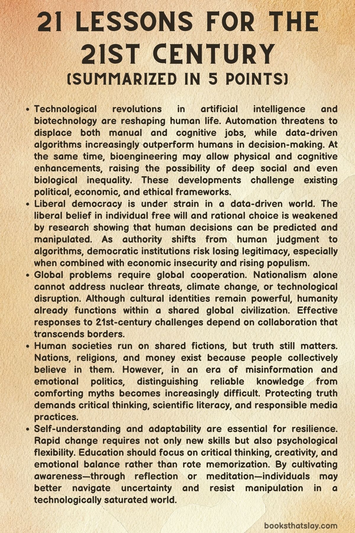 Throughout 21 Lessons for the 21st Century, Harari calls for intellectual honesty, global cooperation, and self-awareness. He does not claim certainty about the future but insists that humanity must confront its challenges thoughtfully.