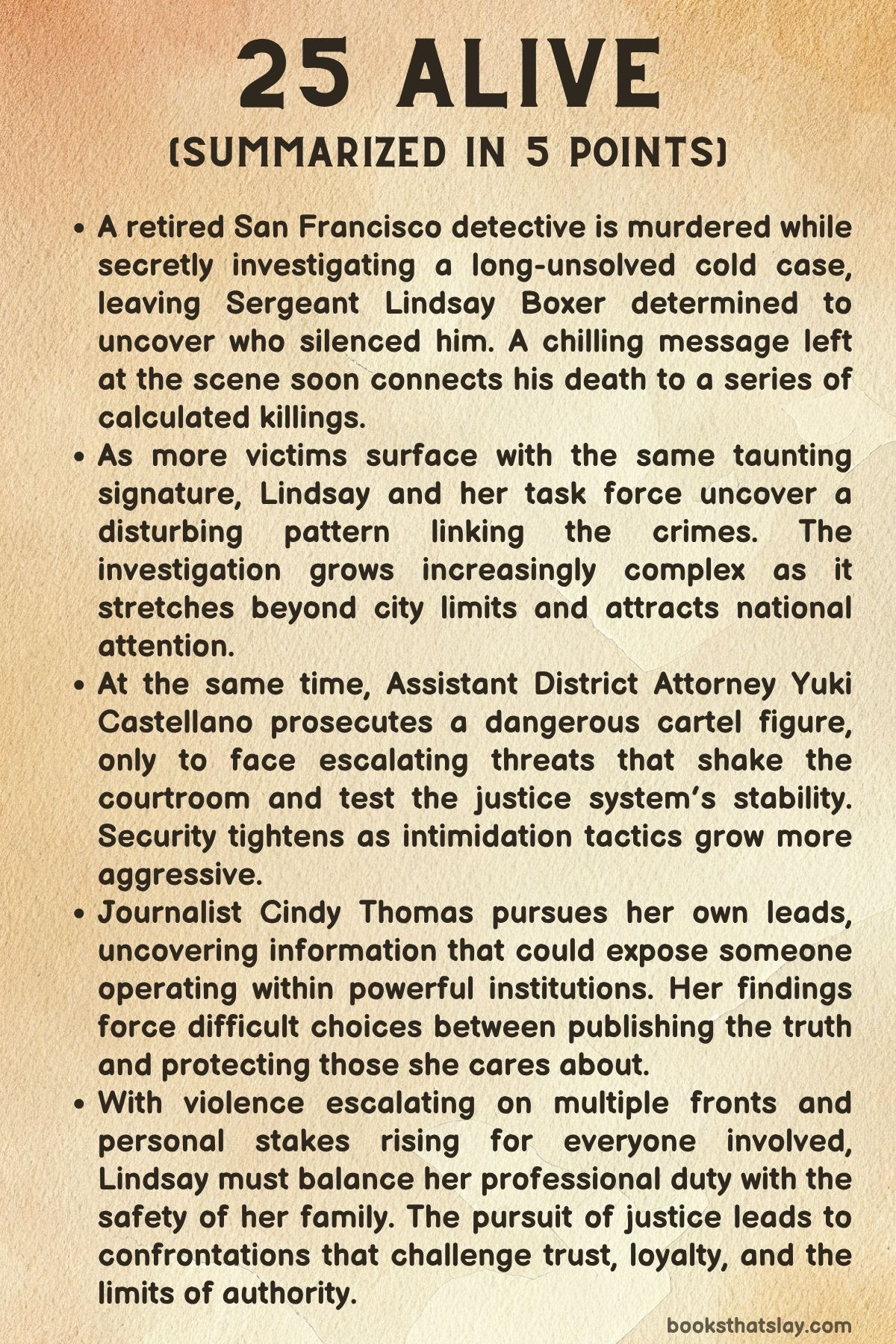 25 Alive by James Patterson and Maxine Paetro is a high-stakes thriller that brings together familiar characters from the Women’s Murder Club series in a layered investigation involving a serial killer, political corruption, and international crime. The story begins with the shocking murder of a beloved retired detective and spirals into a tense hunt for justice, filled with emotional reckonings and deadly confrontations.