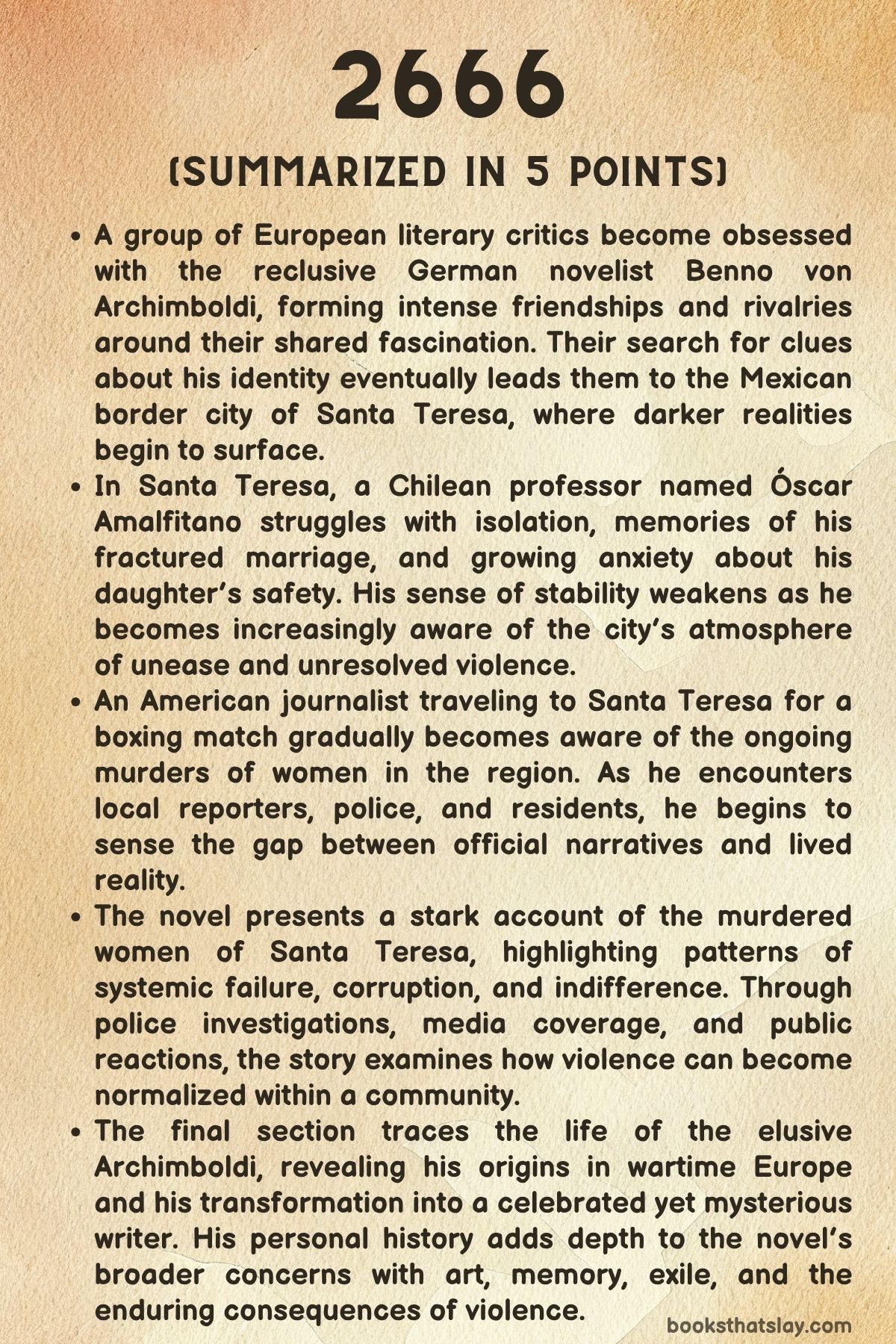 2666 by Roberto Bolaño is a vast, restless 5 part novel that moves across continents and decades, circling the same set of mysteries from different angles. It begins with comedy and intellectual vanity in the world of literary scholarship, then shifts into family breakdown, political exile, journalism, and a city haunted by relentless violence.