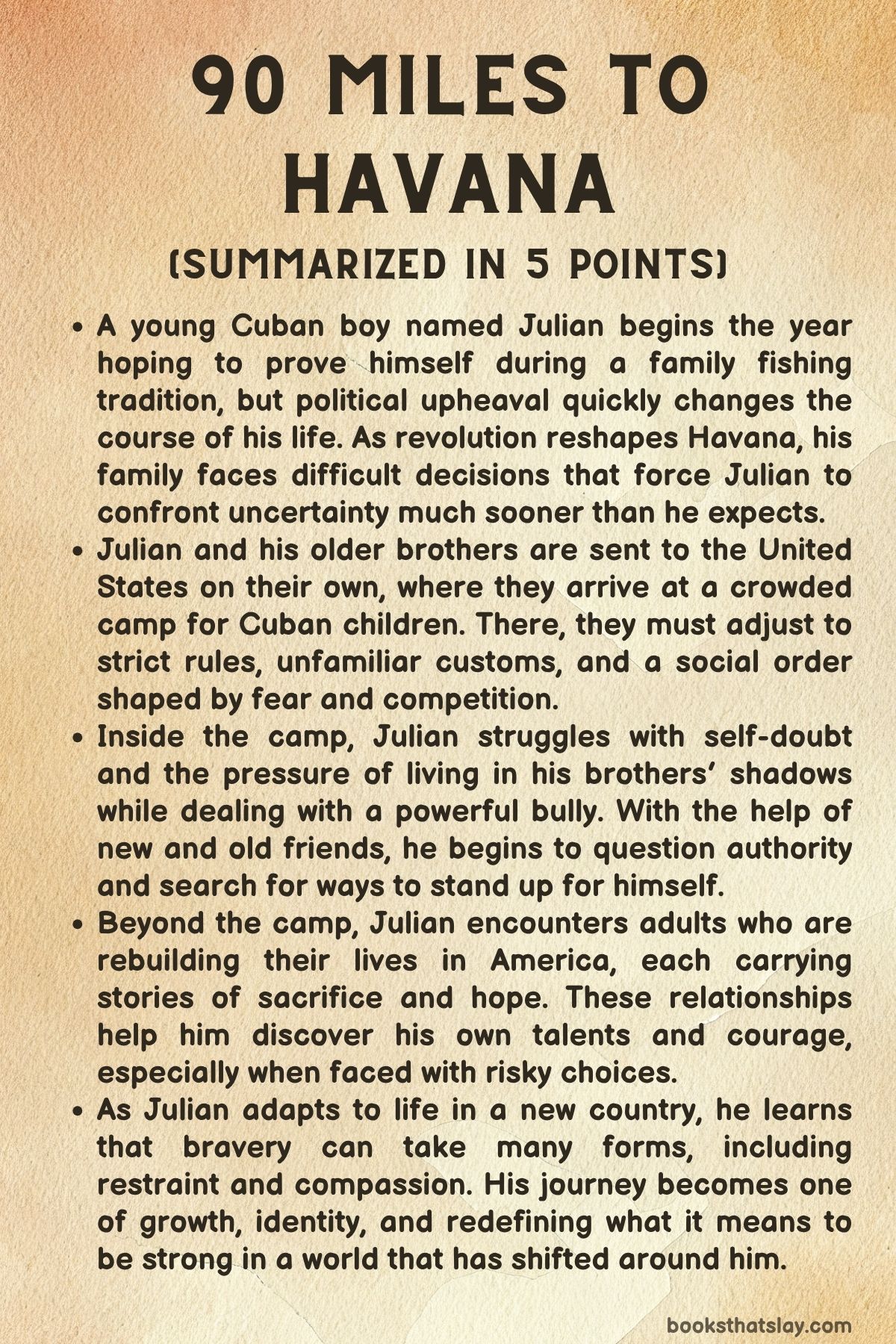 Julian is the emotional and moral center of 90 Miles to Havana, and the story traces his movement from insecurity to self-awareness. At the beginning, he is desperate to prove himself, especially in comparison to his older brothers.