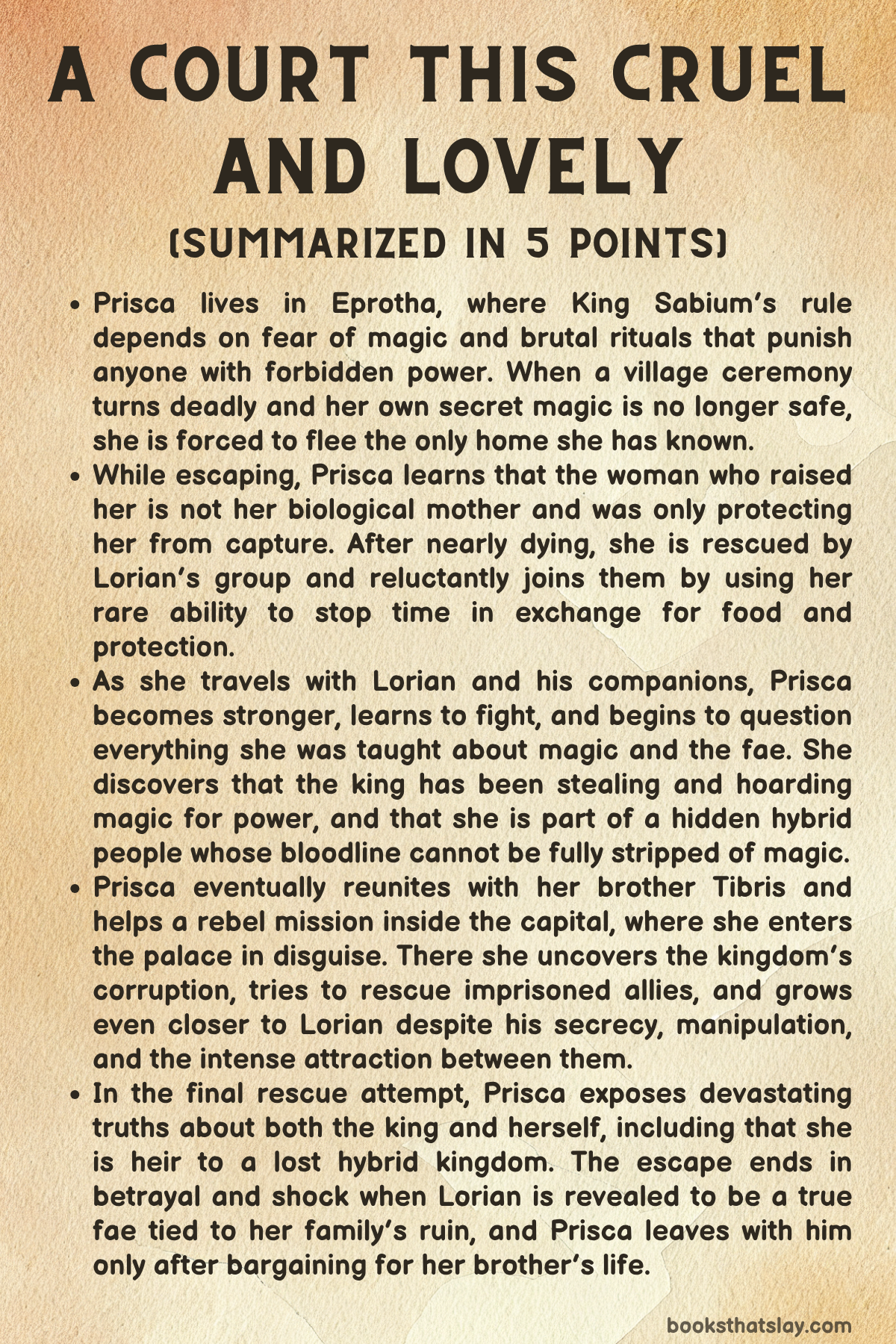 Even in that chaos, another revelation lands: Prisca is the heir to the hybrid kingdom. Before she can fully absorb it, Demos is struck by an arrow while protecting her. Unable to save him by ordinary means, Prisca makes a desperate bargain with Lorian. In exchange for Demos’s life, she agrees to go with Lorian to his kingdom. Though her brother survives, Prisca’s victory is bitter. She has helped ignite rebellion, exposed the king’s lies, and stepped into her true identity, but she ends the book bound to the man connected to her family’s destruction, determined that one day he will answer for it.