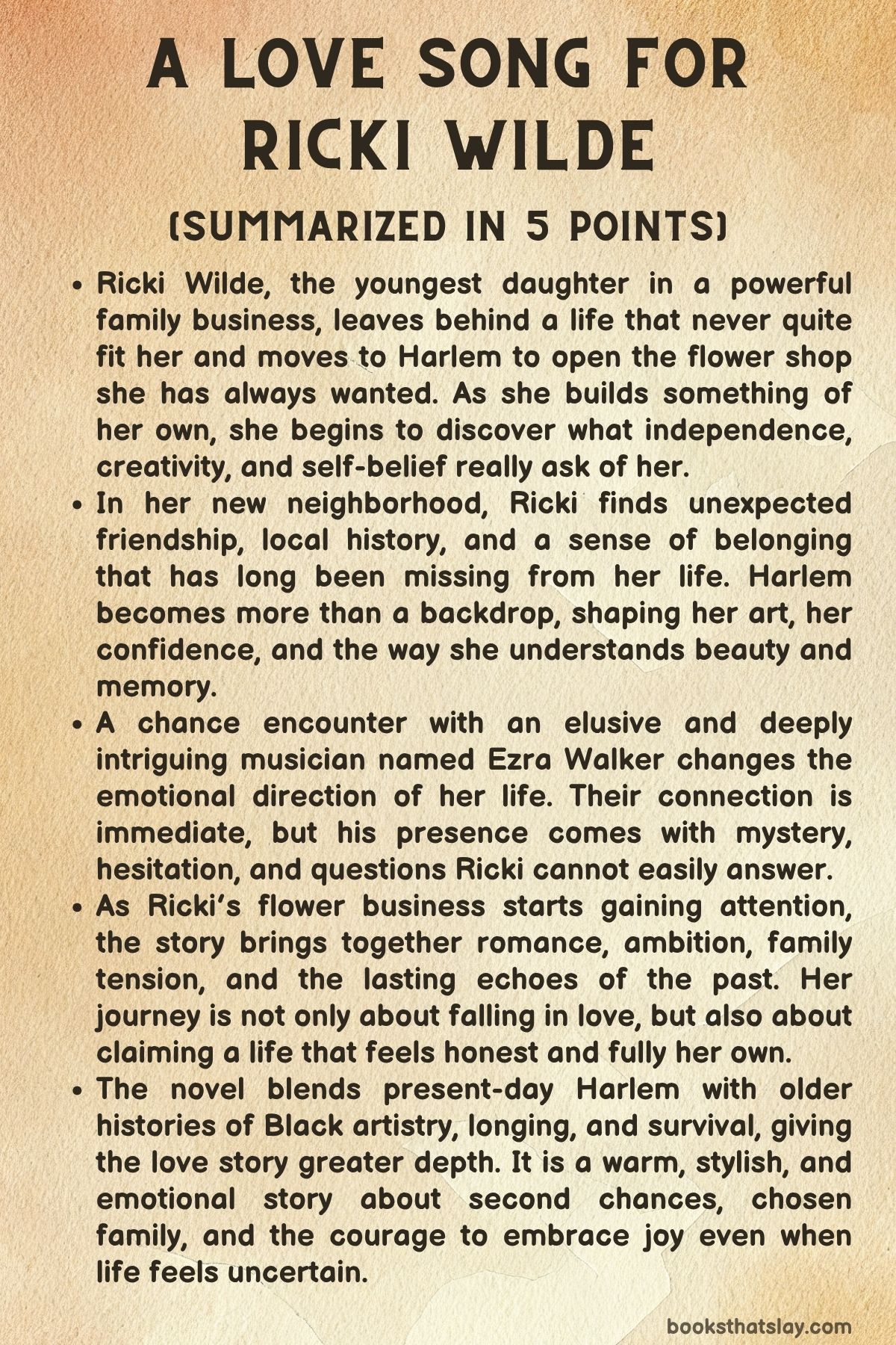 In Harlem, her love of flowers, old beauty, and Black cultural history opens the door to friendship, purpose, and an unexpected connection with a man tied to the neighborhood in ways that seem impossible. The novel blends romance, family tension, history, humor, and the idea that love can change the direction of a life.