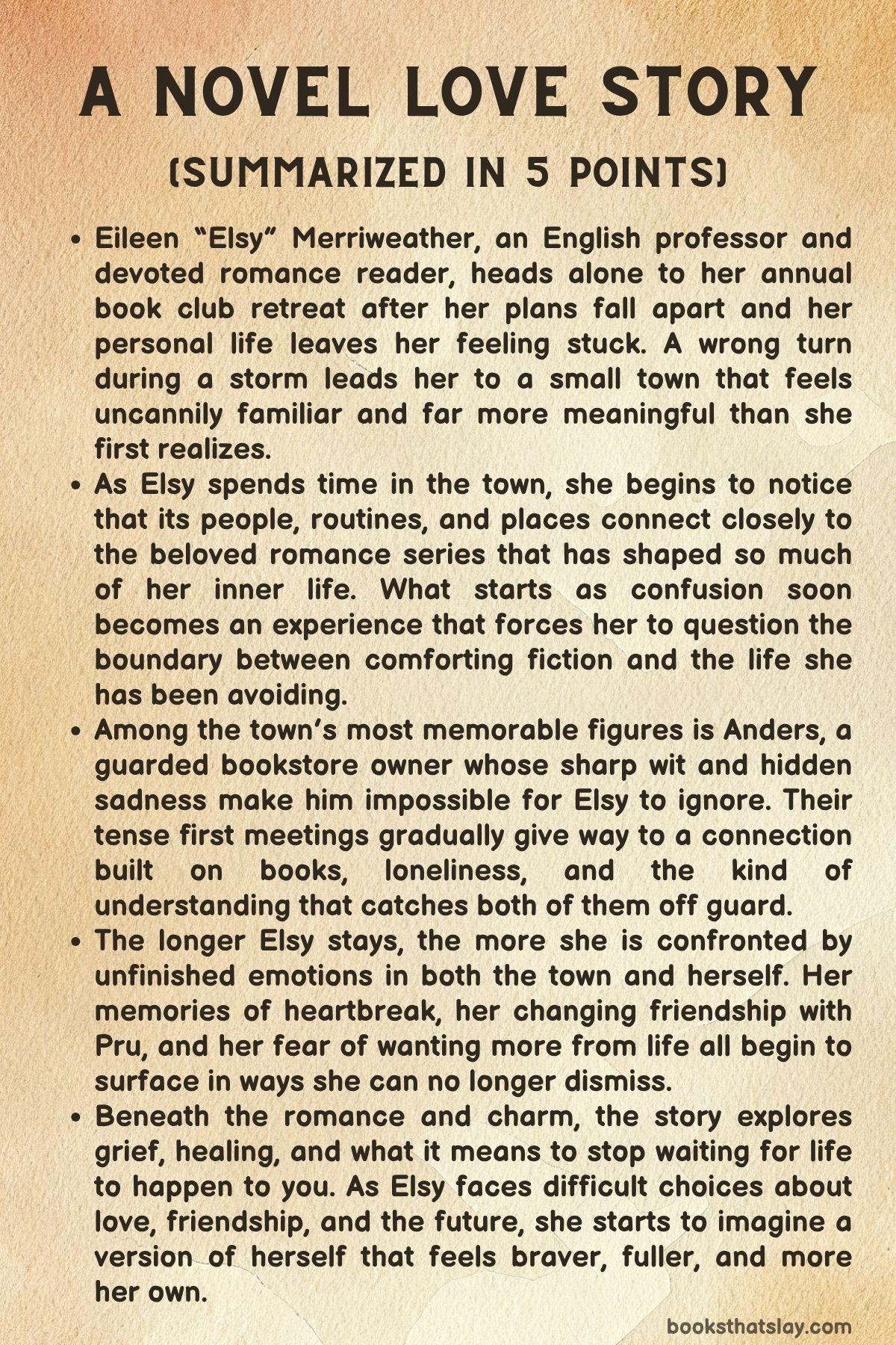 A Novel Love Story by Ashley Poston is a contemporary romance with a light touch of fantasy, built around the idea of what books can mean to people who feel stuck, lonely, or uncertain about their lives. The story follows Eileen “Elsy” Merriweather, an English professor and devoted romance reader who accidentally finds herself inside the fictional town from her favorite unfinished book series.