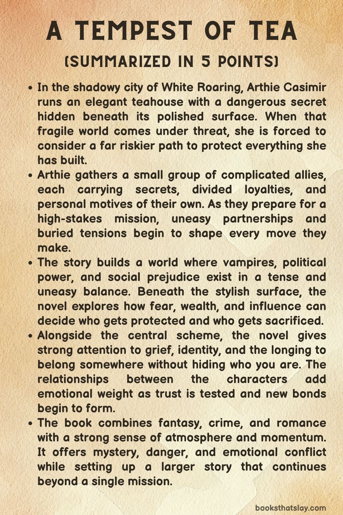 A Tempest of Tea by Hafsah Faizal is a fantasy novel set in the city of White Roaring, where tea, blood, power, and colonial violence shape everyday life. At its center is Arthie Casimir, a sharp, guarded young woman who runs an elegant teahouse that hides a dangerous secret.