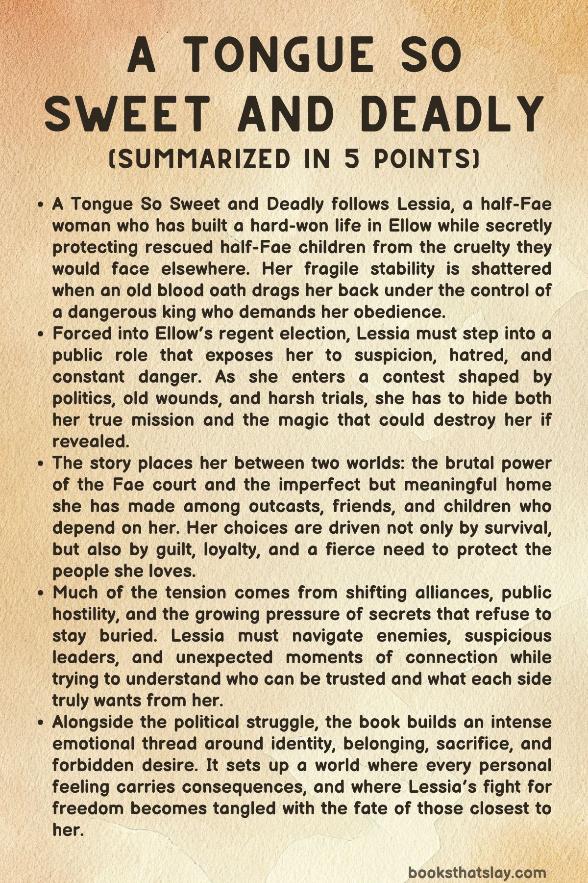 A Tongue So Sweet and Deadly by Sophia St Germain is a fantasy novel built around secrecy, coercion, political danger, and divided loyalties. At its center is Lessia, a half-Fae woman who has made a life for herself in Ellow while carrying the weight of an old blood oath that still binds her to a cruel king.