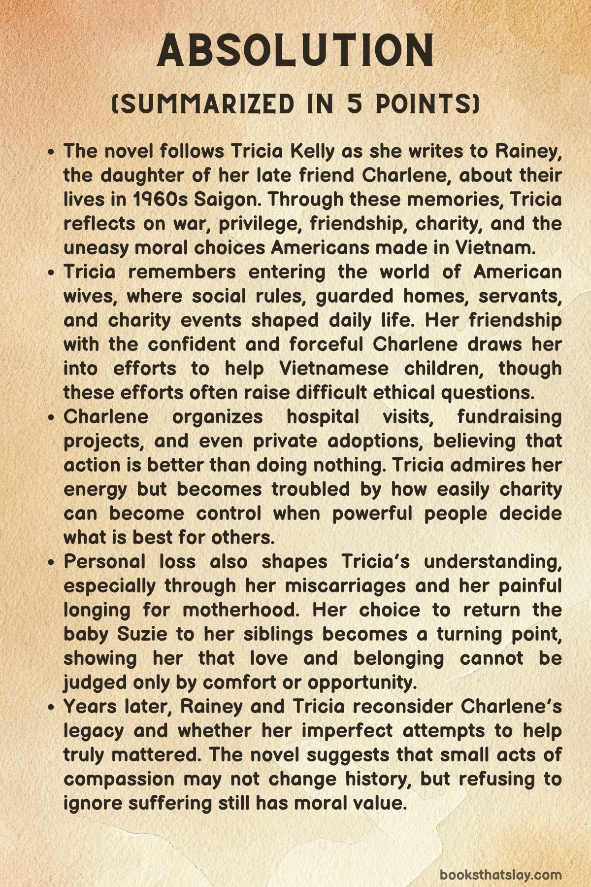 The story begins many years after the Vietnam War, when Patricia “Tricia” Kelly writes a long letter to Rainey, the adult daughter of her friend Charlene. Tricia is now elderly and reflecting on events from 1963, when she was a young American living in Saigon with her husband Peter.