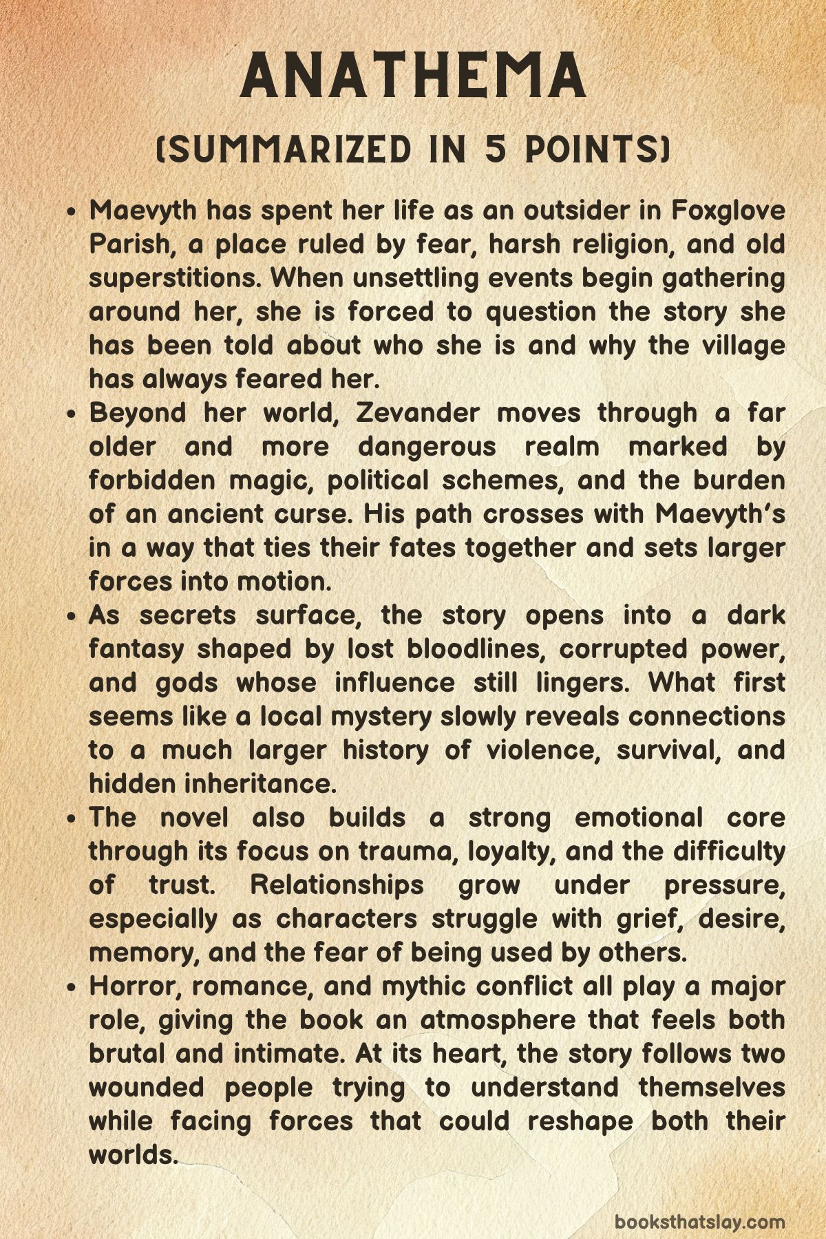 Anathema by Keri Lake is the first book in The Eating Woods Duology, a gothic dark fantasy novel that takes us into a world of forbidden magic, curses, and a slow-burn romance. At its center is Maevyth, a feared young woman from a harsh village where religion is used as control, and Zevander, a scarred immortal assassin carrying a curse that has ruled his life for centuries.