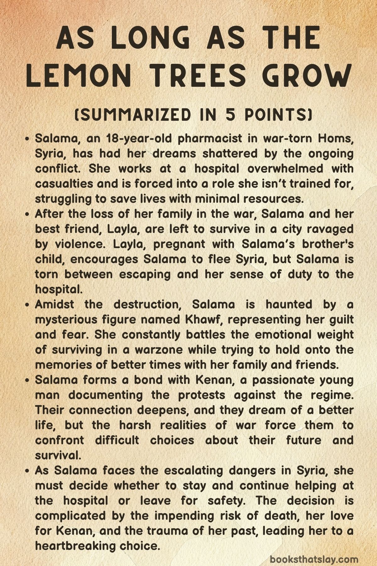 As Long as the Lemon Trees Grow by Zoulfa Katouh is a powerful, heart-wrenching young adult novel that blends contemporary war fiction with elements of magical realism. Published in 2022, it draws from the real horrors of the Syrian Revolution and Civil War while centering an intimate, deeply emotional story of survival, grief, guilt, love, and resilience.