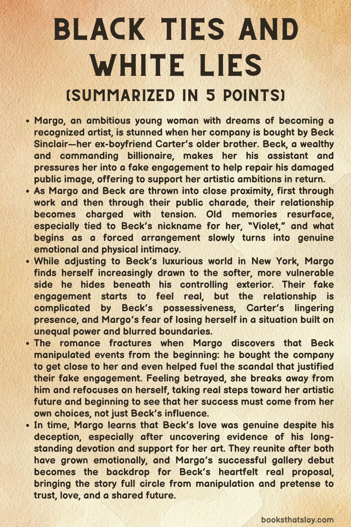 By the end, Black Ties and White Lies comes full circle: what began as a forced arrangement evolves into a romance that thrives on honesty, passion, and the willingness to risk everything for love. Beck and Margo step into their future not as a façade for the world, but as partners ready to build a life on their own terms.