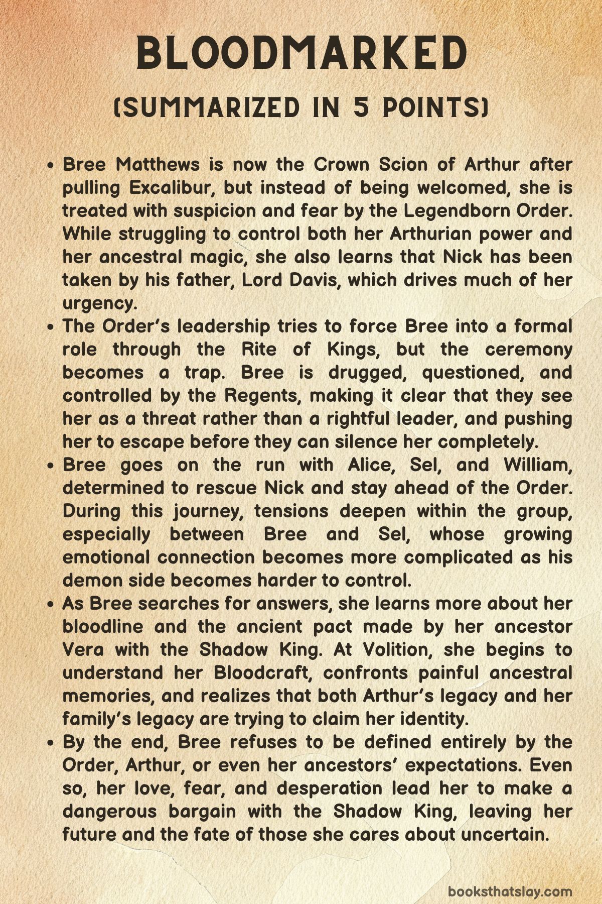 Bree stands at the center of Bloodmarked as a protagonist defined by pressure from every direction. Her struggle is not simply about learning to use power, but about deciding what that power means when other people have already assigned meanings to it.