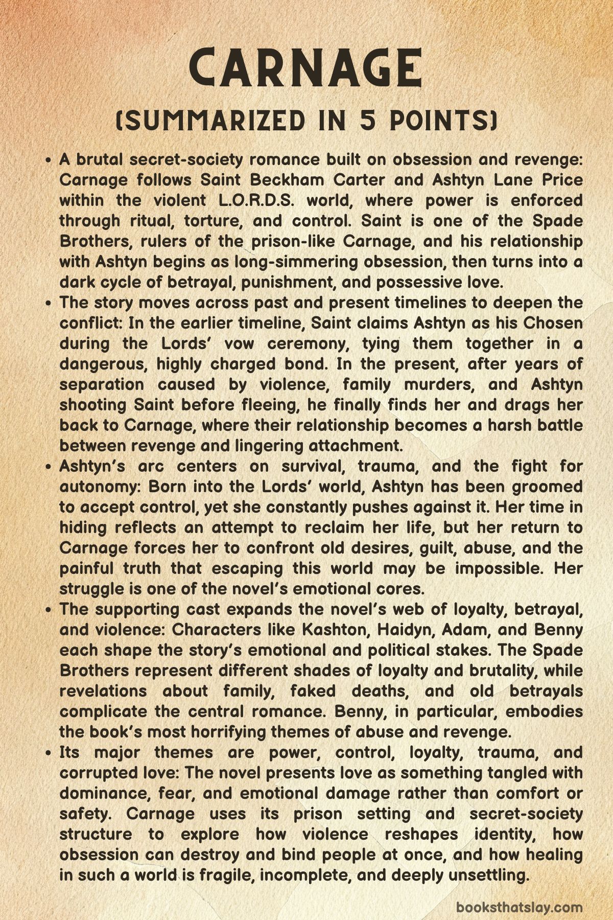 The story unfolds in dual timelines and centers on Saint Beckham Carter, one of the Spade Brothers who run Carnage — a hidden, hellish prison where Lords who betray their oaths are sent to be broken, tortured, and imprisoned for life, often losing their sanity. The Spade Brothers (Saint, Kashton, Haidyn, and Adam) are not blood relatives but a designated group of elite Lords tasked with enforcing this brutal system, taking over from their predecessors.