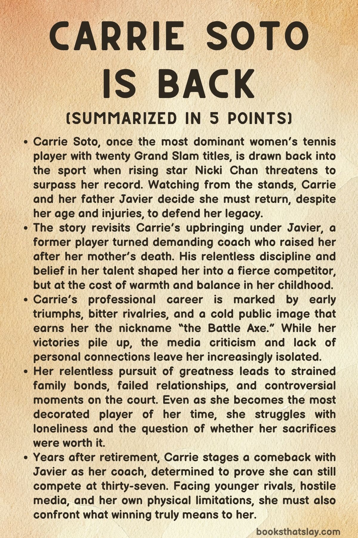 The story opens at the 1994 U.S. Open final, where Carrie Soto and her father Javier watch Nicki Chan compete against Ingrid Cortez. Chan’s win ties her close to Carrie’s long-held record of twenty Grand Slam titles, sparking Carrie’s decision to return to the sport and defend her legacy.