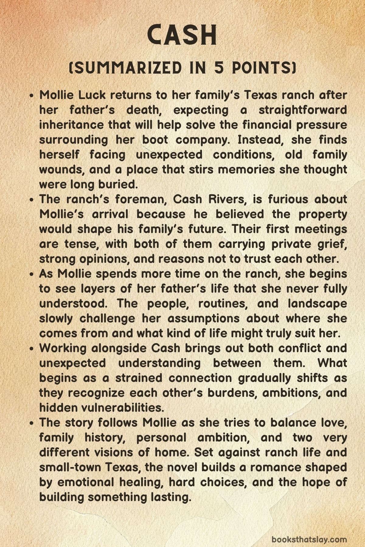 Cash by Jessica Peterson is a contemporary small-town cowboy romance set in Texas, and the first novel in the Lucky River Ranch series. At its center is Mollie Luck, a Dallas entrepreneur who returns to her late father’s ranch expecting a straightforward inheritance, only to find herself pulled into an unfamiliar life filled with hard work, old grief, and unfinished family history.