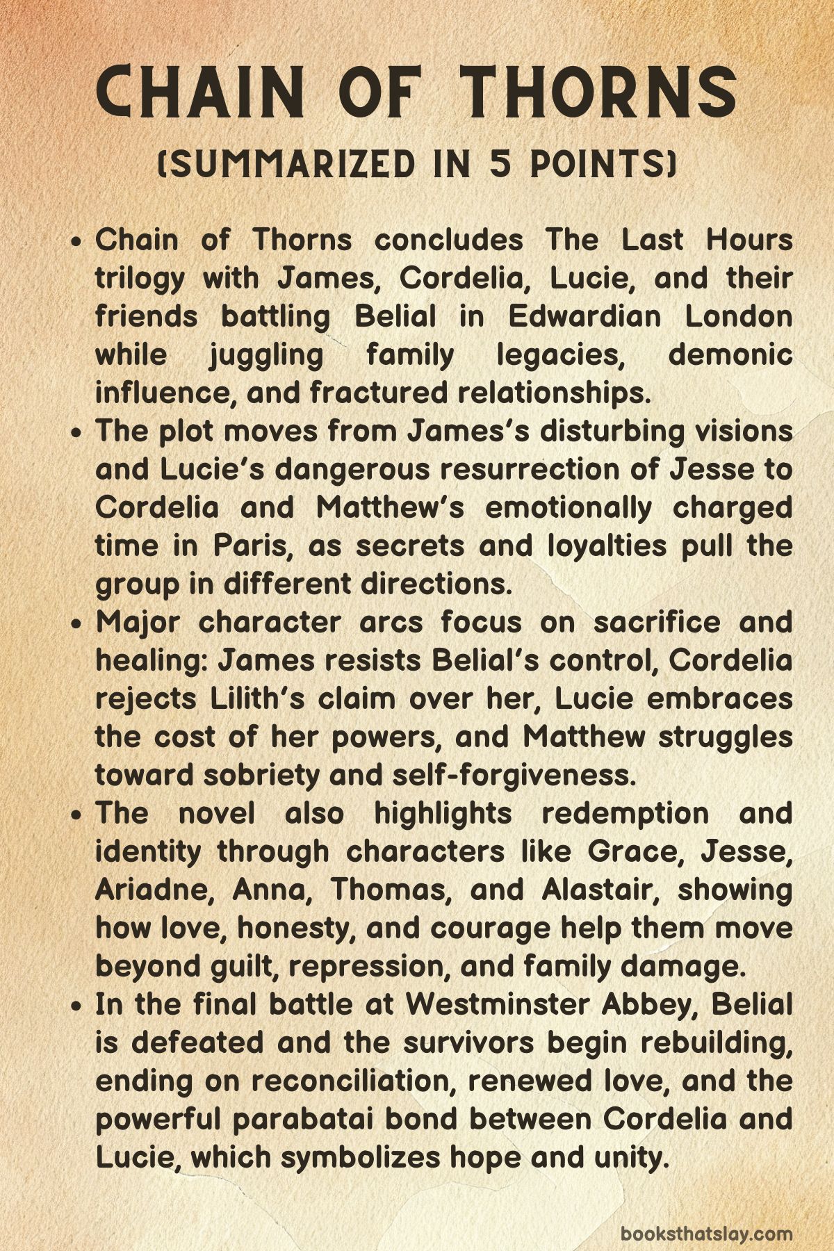 Despite betrayal, loss, and political divisions, the younger generation in Chain of Thorns repeatedly demonstrates that unity is the strongest defense against overwhelming evil. The parabatai bond between Cordelia and Lucie crystallizes this idea at the end of the novel, when they pledge to stand together until death, supported by blessings from generations of Shadowhunters.