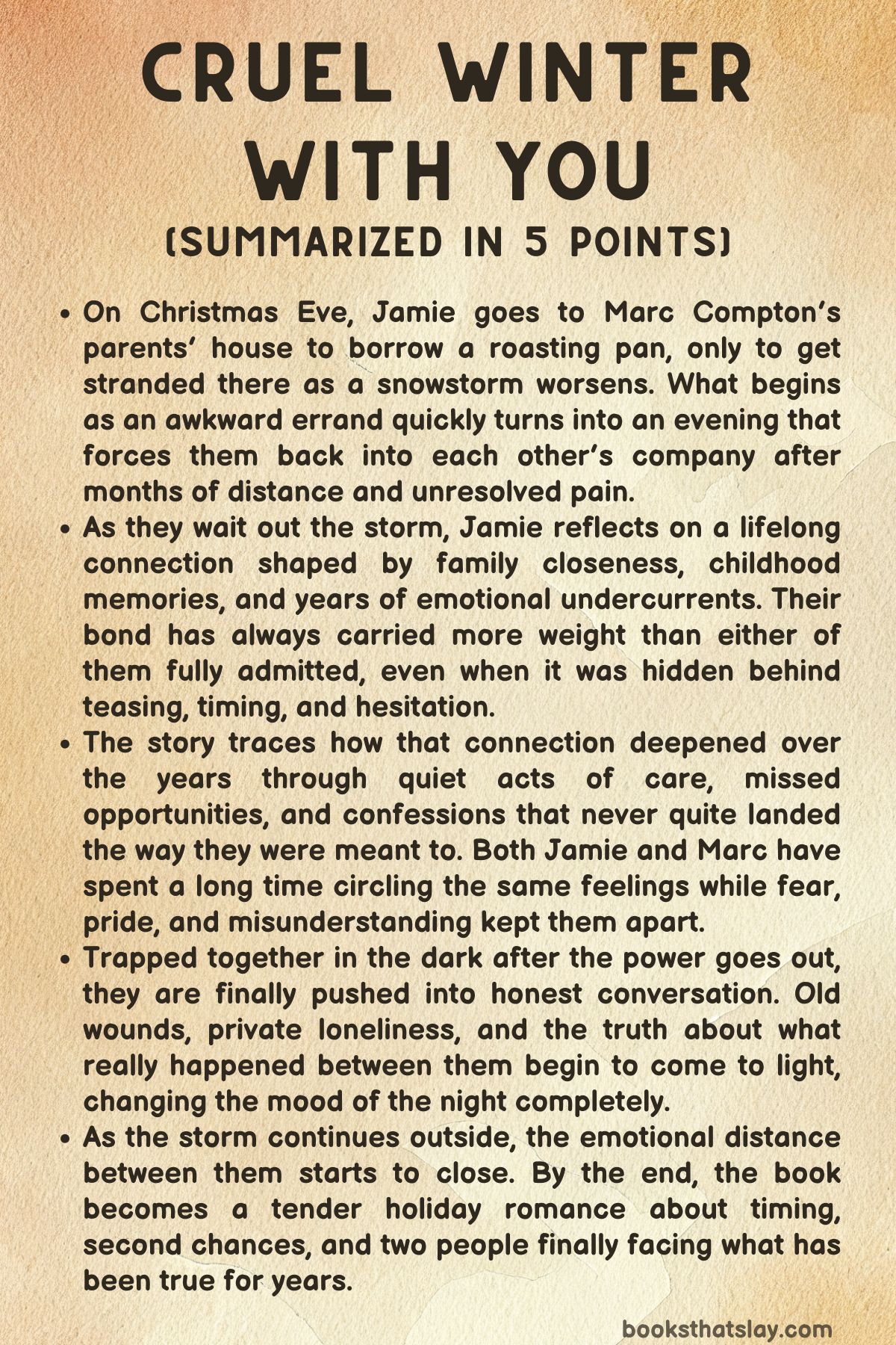 The story takes place over one stormy Christmas Eve, but it carries the full emotional weight of childhood memories, family closeness, old wounds, and adult fear. It is intimate, funny, tense, and tender, using one forced night together to finally bring long-buried love into the open.