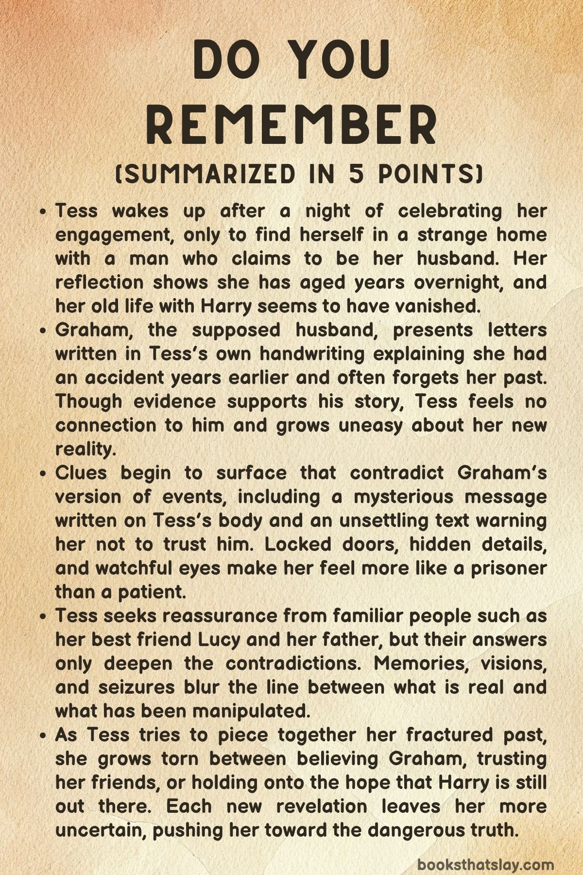 Do You Remember by Freida McFadden is a psychological thriller that explores the fragile boundaries between memory, identity, and trust. The novel follows Tess, a woman who wakes up after what seems like a night of celebration, only to find herself in a life she doesn’t recognize.