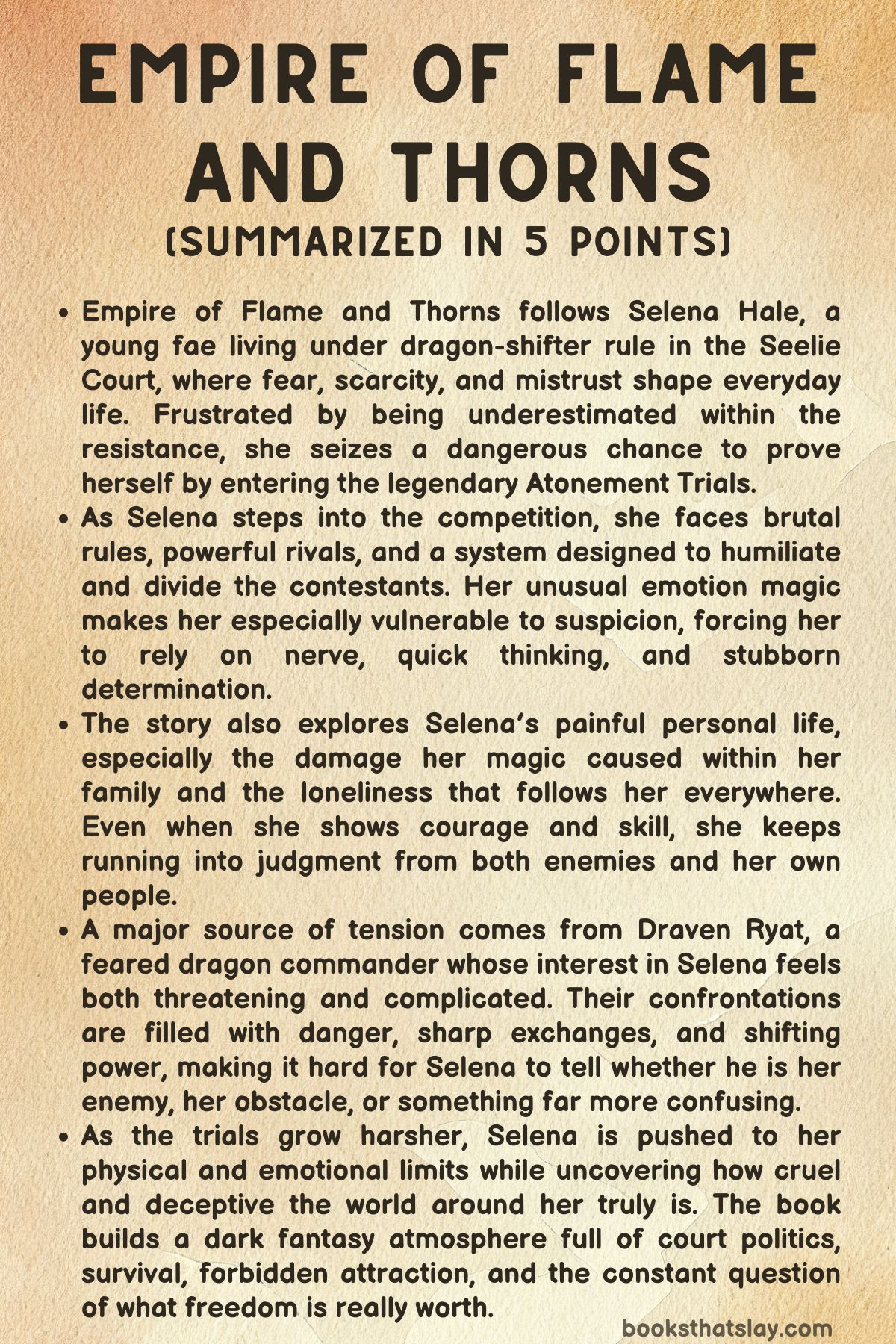 When she enters the legendary Atonement Trials, she hopes to earn freedom, purpose, and a chance to matter. Instead, she is pulled into a ruthless contest filled with violence, deception, political cruelty, and a dangerous connection to the very dragon commander she should hate most. It’s the first book in the Flame and Thorns series.