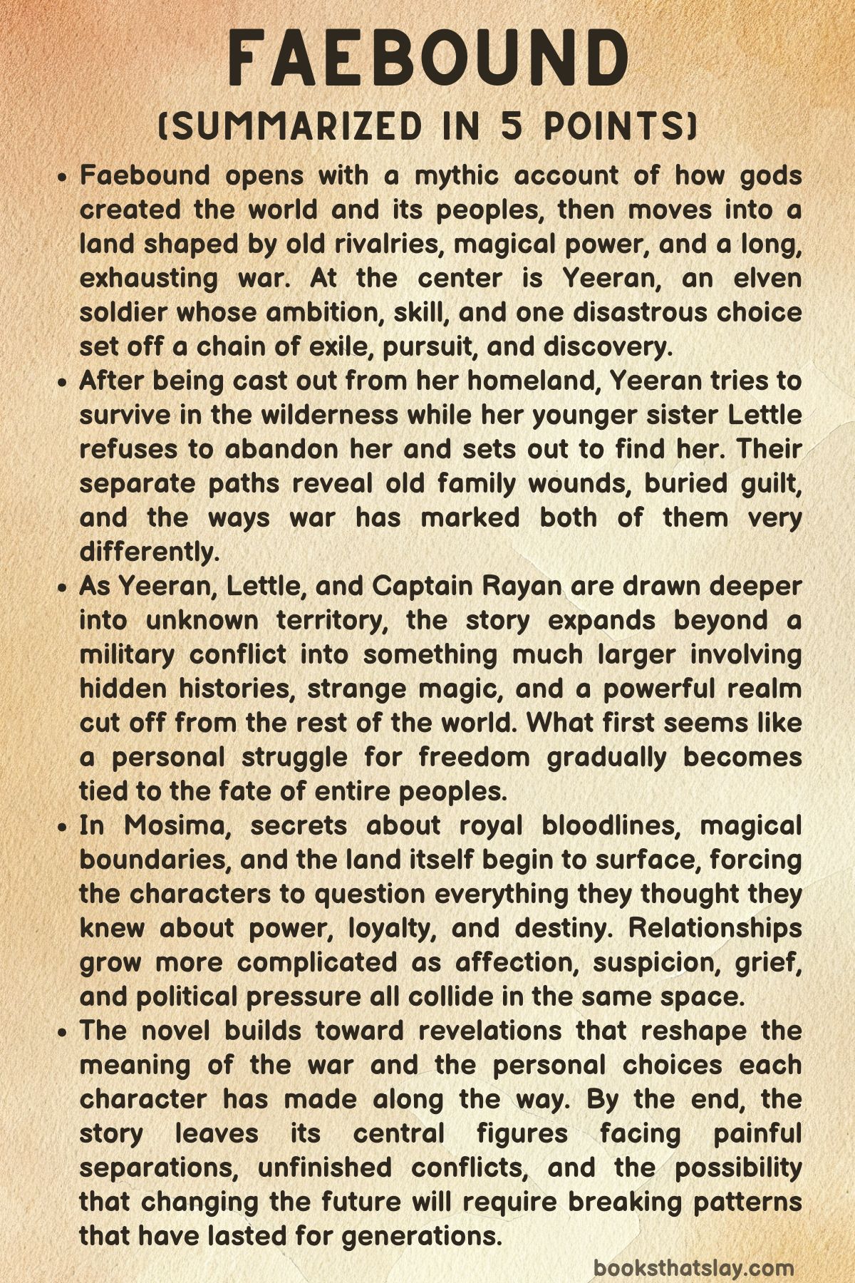 Faebound is an epic fantasy built on exile, war, prophecy, and divided loyalties. Saara El-Arifi begins with a mythic account of how gods created humans, fae, and elves, then moves into a story driven by sisters whose bond is tested by duty, guilt, and survival.