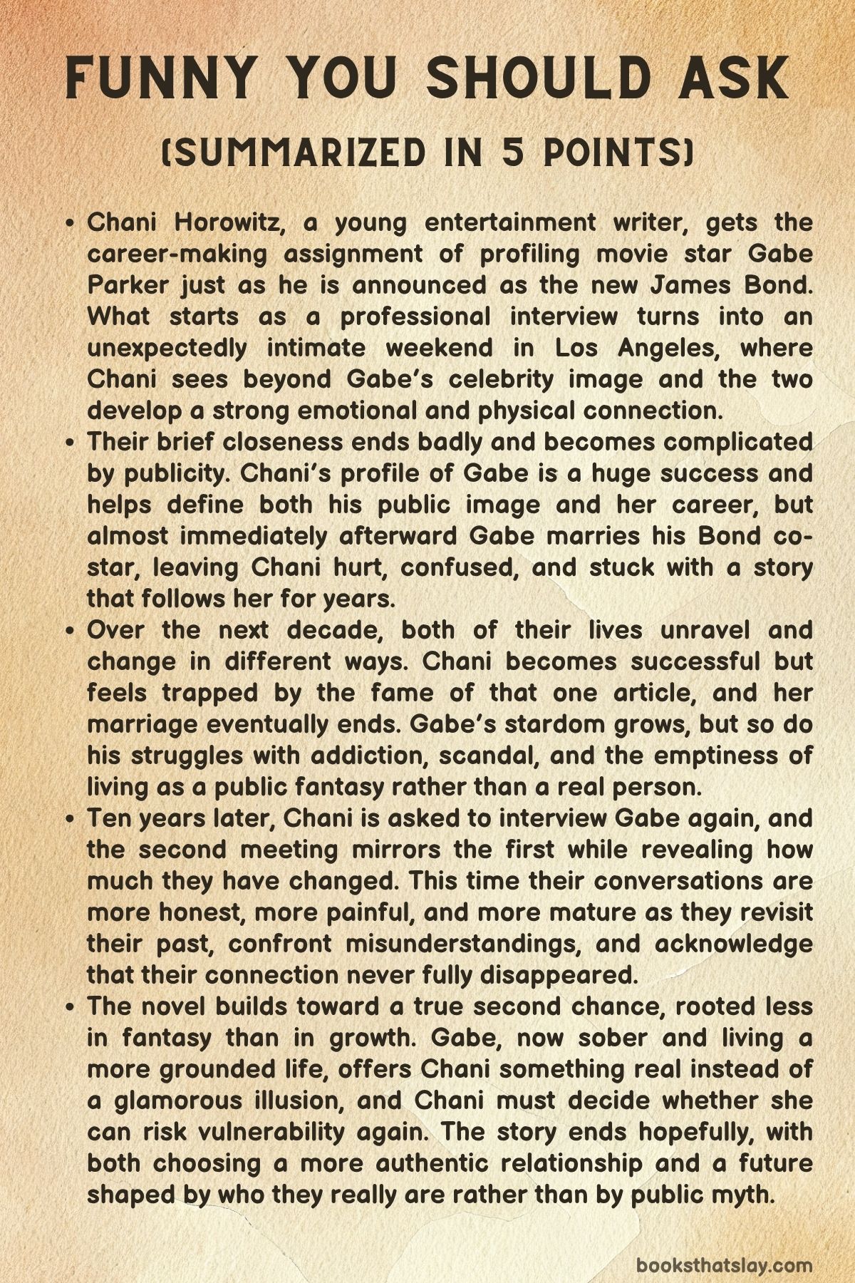 Chani is the emotional and intellectual center of Funny You Should Ask, and her arc is built around identity, self-respect, and the cost of being seen only through one defining story. At the beginning, she is talented but professionally frustrated, caught between the literary life she imagined for herself and the celebrity journalism career she has actually built.