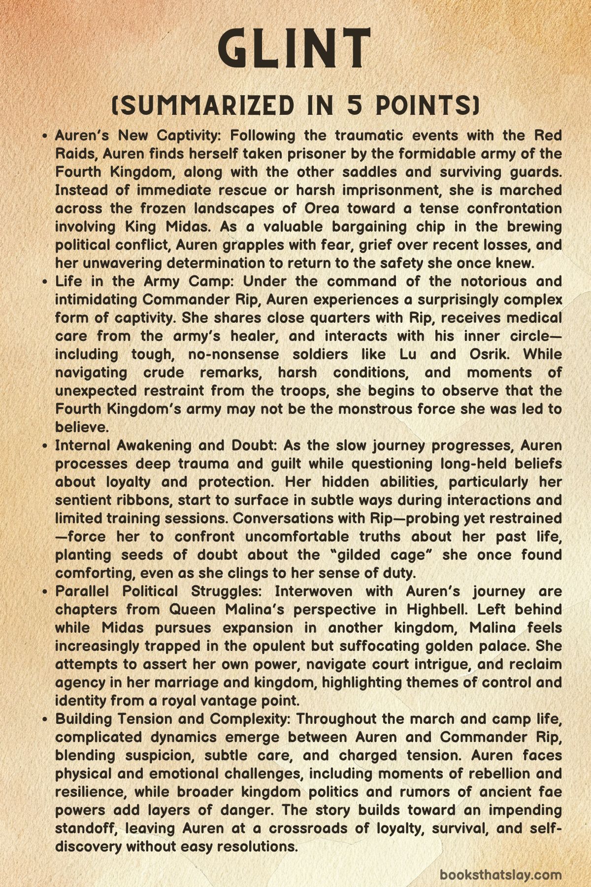 As Malina struggles to reclaim her lost power and identity, Auren battles against the harsh realities of her captivity and growing emotions for the enigmatic commander Rip. With a backdrop of political intrigue, hidden powers, and deep emotional conflict, Glint weaves a gripping narrative that keeps readers questioning loyalty, love, and the true meaning of freedom.