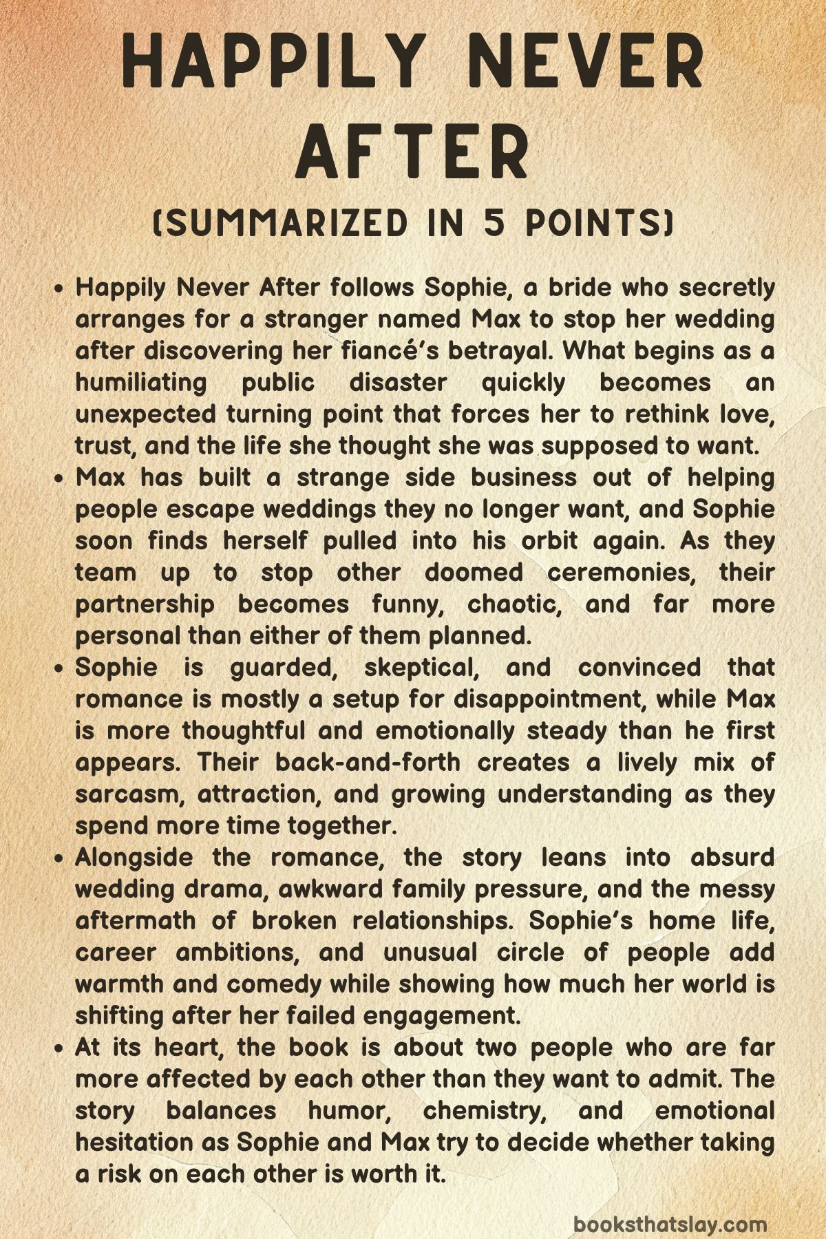 Beneath the sharp humor and public disasters, the story follows two people who are badly burned by trust, both of them skeptical about love for different reasons. Sophie begins the book convinced romance is mostly a bad bargain, while Max has found a strange purpose in rescuing people from terrible marriages before they begin. What starts as a messy alliance slowly becomes something much riskier, more intimate, and far harder to control.