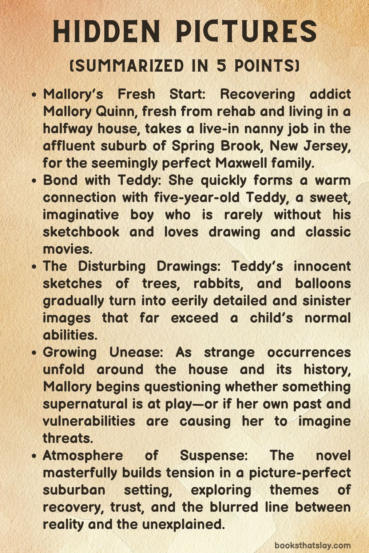 Hidden Pictures by Jason Rekulak is a psychological thriller that delves into the complexities of recovery, guilt, and the supernatural. The story follows Mallory Quinn, a woman recovering from addiction who becomes a nanny for a young boy named Teddy.
