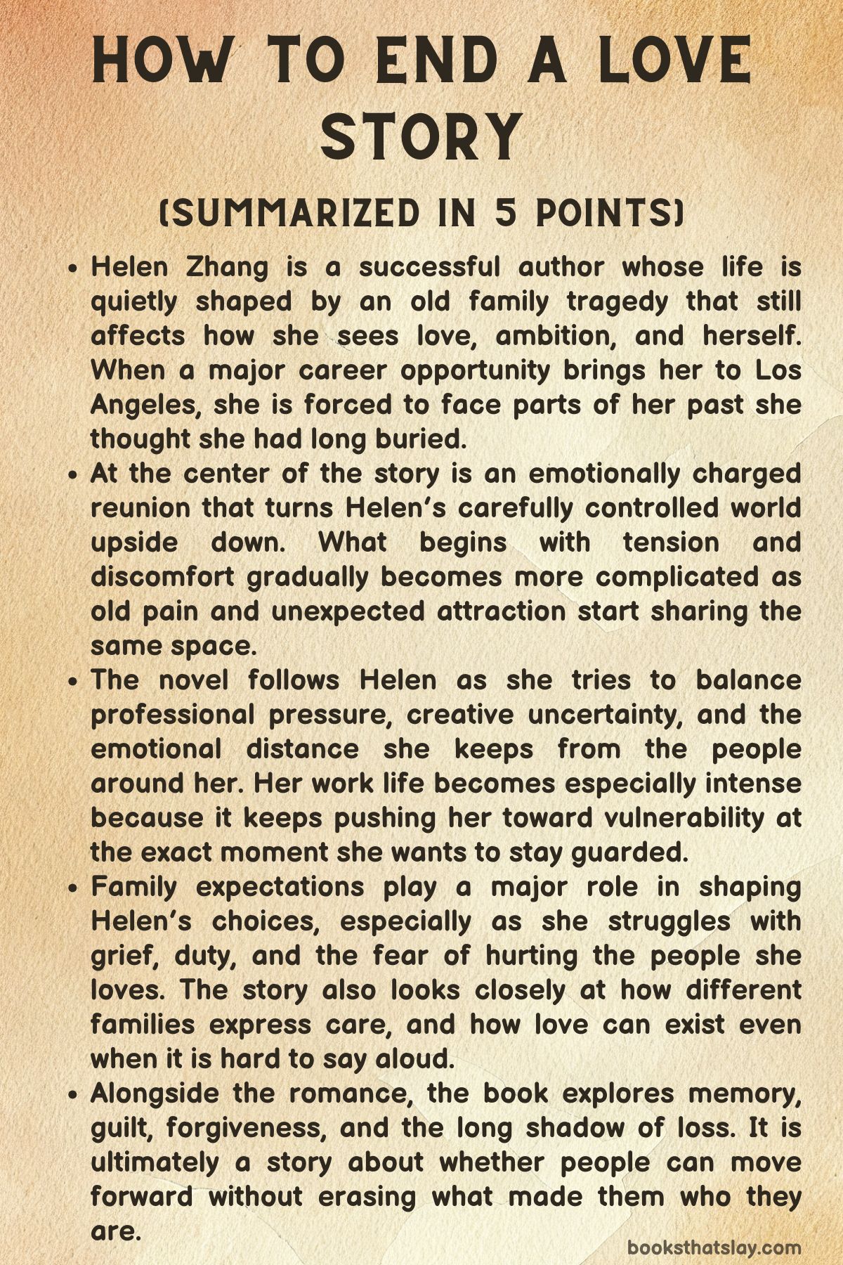 Helen Zhang is the emotional and psychological center of How to End a Love Story. She begins the novel as someone who has achieved outward success while remaining inwardly suspended in grief.