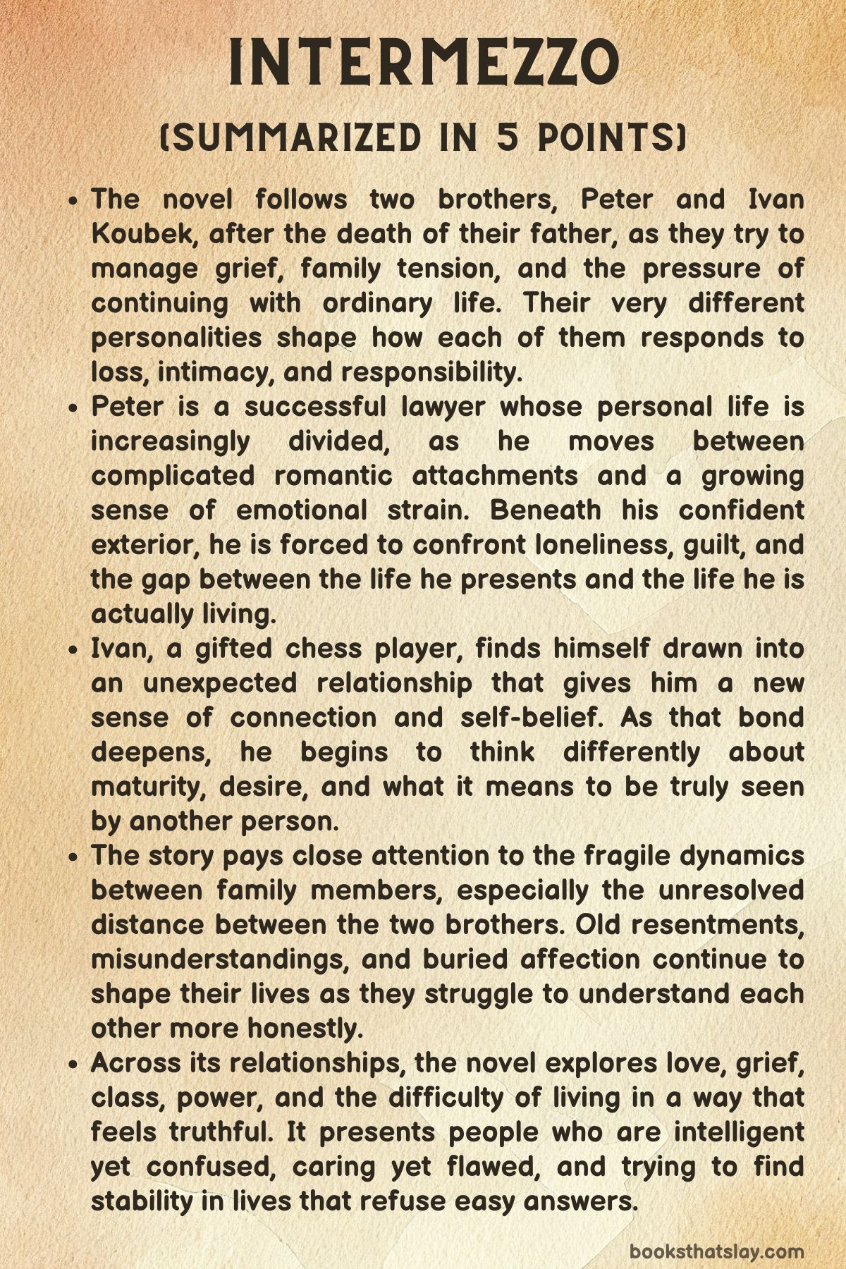 Intermezzo by Sally Rooney is a novel about grief, desire, class, power, and the uneasy ways people try to care for one another. It follows two brothers, Peter and Ivan Koubek, after their father’s death, as each moves through love, guilt, memory, and resentment in very different ways.