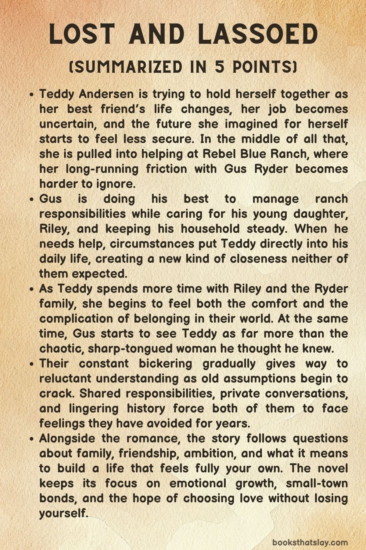 Lost and Lassoed by Lyla Sage is a contemporary small-town romance set in Meadowlark, Wyoming, where family ties, long memories, and old frustrations shape daily life. The novel follows Theodora “Teddy” Andersen and Augustus “Gus” Ryder, two people who have spent years trading insults while hiding a deeper and more complicated history.