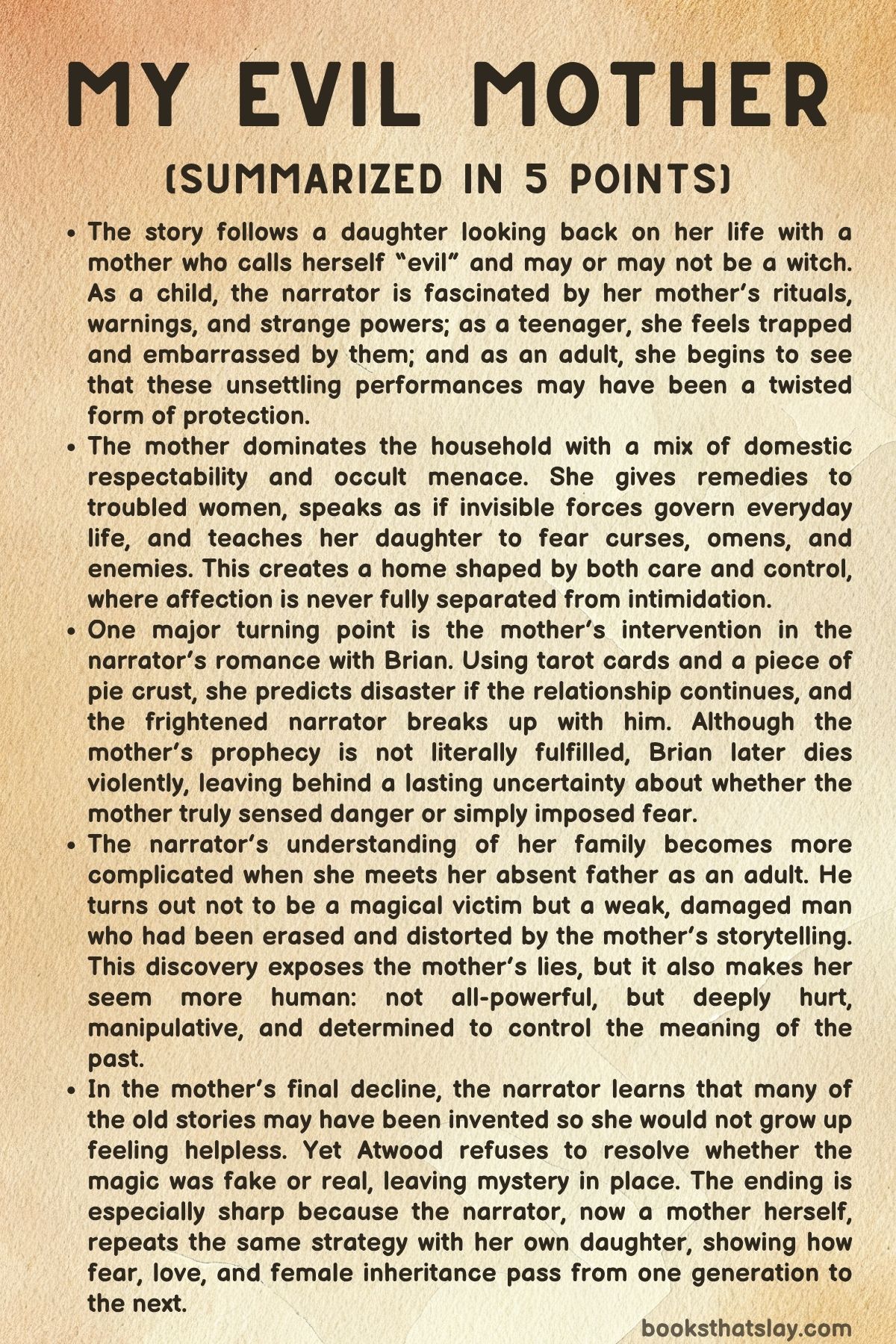 The story is narrated by a woman looking back on her life with her unusual mother, a woman who openly described herself as evil but insisted that she used her powers only for good. When the narrator was fifteen, she and her mother often argued, especially about boys.