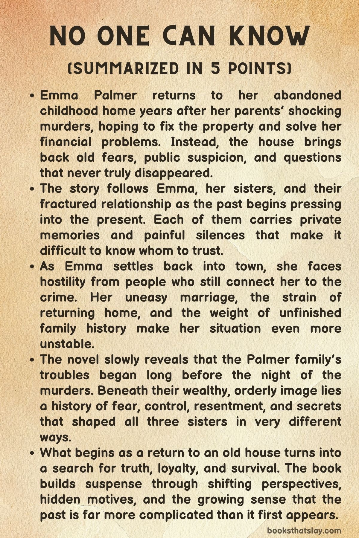 No One Can Know by Kate Alice Marshall is a psychological suspense novel about three sisters bound by trauma, secrecy, and a crime that never truly stayed in the past. Fifteen years after their parents were found shot dead in the family home, Emma Palmer returns to the place she has spent years avoiding.