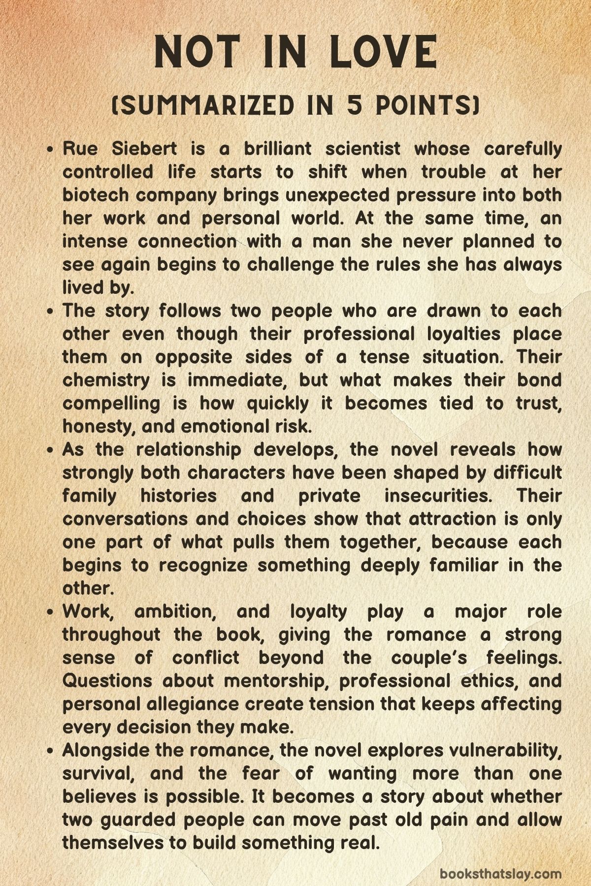 Not in Love by Ali Hazelwood is a contemporary romance that pairs sharp science-world tension with a deeply personal love story. Set around a biotech company under financial pressure, the novel follows Rue Siebert, a brilliant but guarded engineer, and Eli Killgore, a private equity partner whose business goals put him in direct conflict with her world.