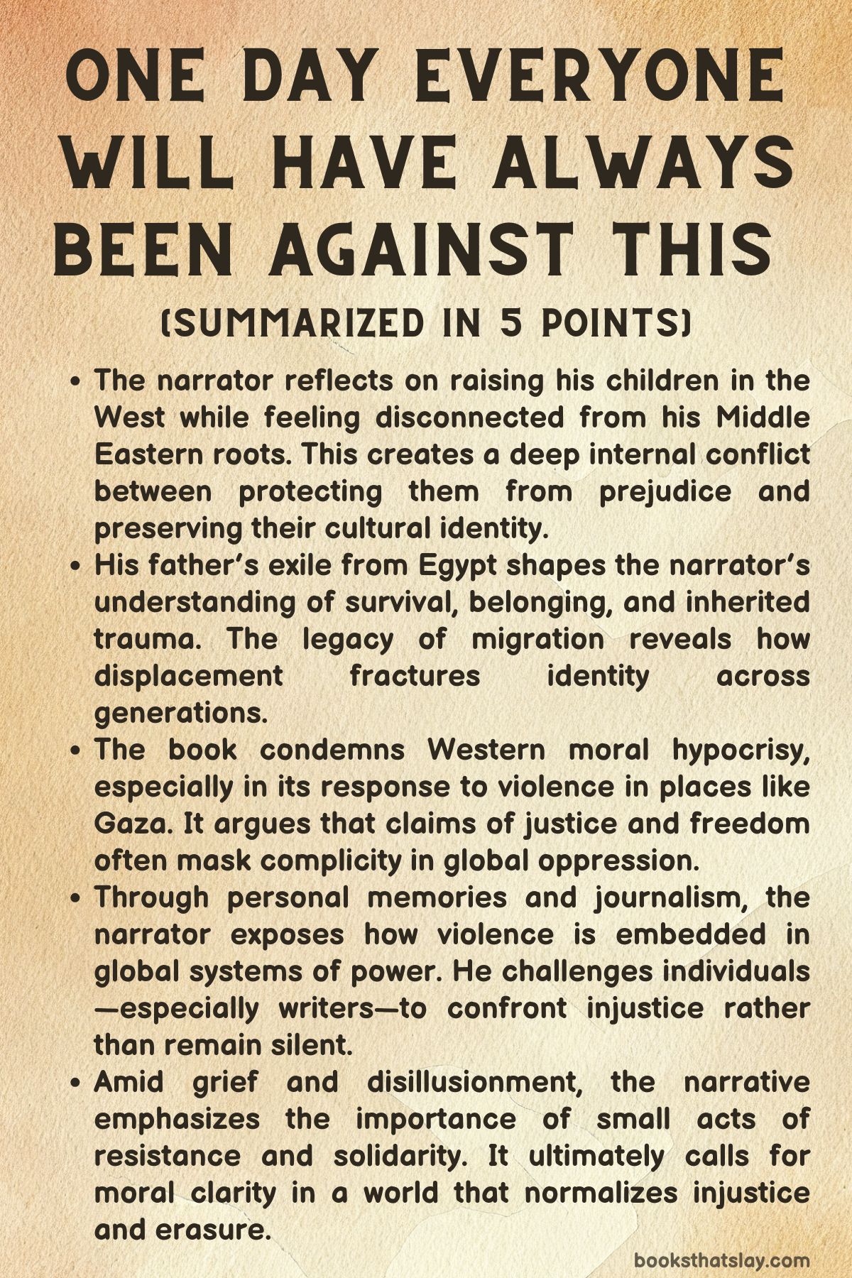 The theme of displacement and its effect on identity is central to One Day Everyone Will Have Always Been. The narrator’s reflections on raising his children in the United States, far from his homeland, highlight the dissonance between his children’s upbringing and his own experiences growing up in the Middle East.