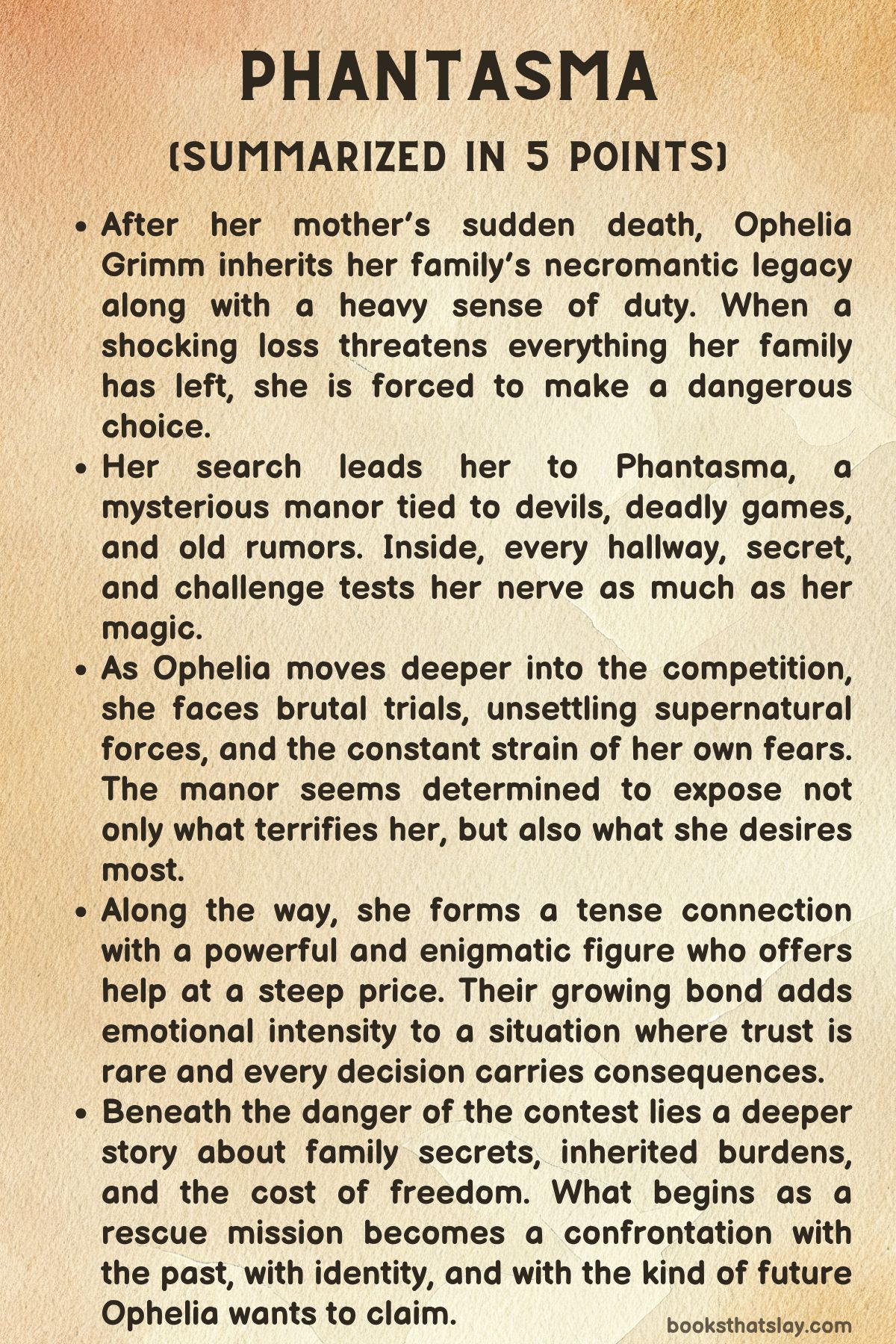 When her sister disappears into Phantasma, a deadly devil-run competition housed inside a haunted manor, Ophelia enters to bring her back. Inside, she faces brutal trials, family secrets, and a dangerous attraction to the mysterious Blackwell. The novel blends horror, paranormal lore, romance, and high-stakes survival while asking what love, legacy, and freedom are really worth.