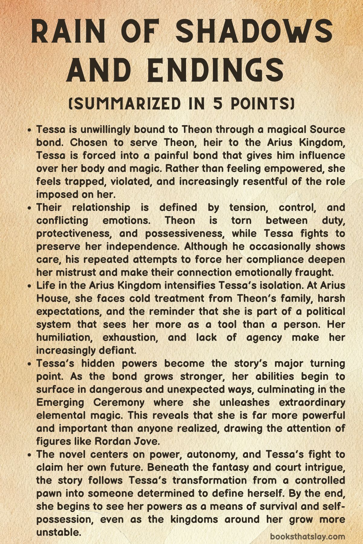The final theme of Rain of Shadows and Endings revolves around Tessa’s journey of self-discovery and personal growth. From the moment she is selected as Theon’s Source, Tessa is thrust into a world that demands her compliance, yet she never stops questioning her place in it.