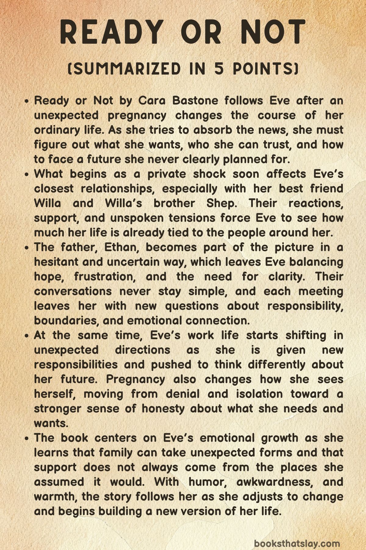 Ready or Not by Cara Bastone is a contemporary novel about an unexpected pregnancy, complicated friendship dynamics, and the slow, surprising reshaping of a life. It begins with Eve, a woman who has never built her identity around marriage, children, or long-term certainty, suddenly learning that she is pregnant after a single encounter.