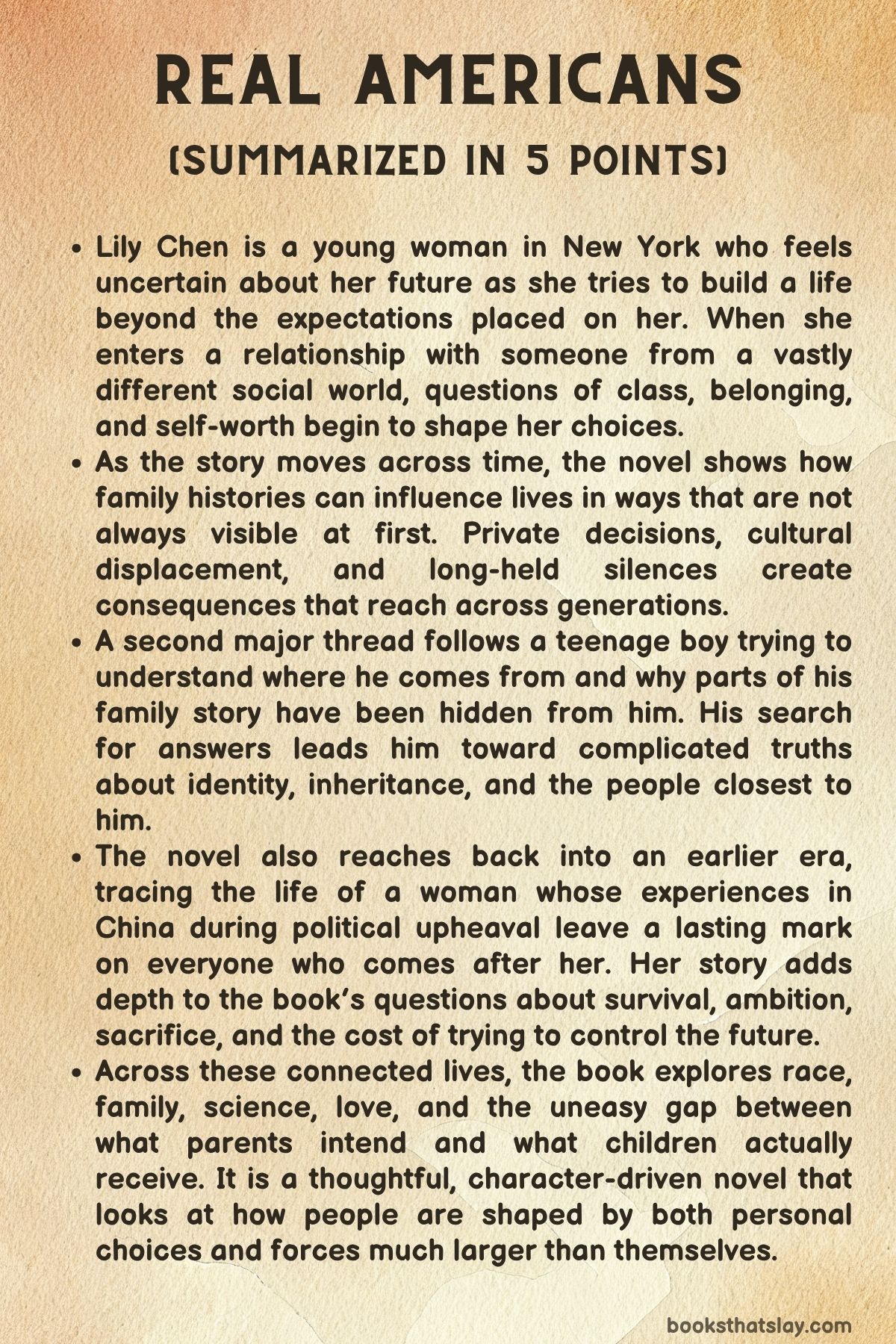 Real Americans by Rachel Khong is a multigenerational literary novel about family, inheritance, race, class, and the uneasy promise of science. Moving across decades and continents, it follows three connected lives: Lily, the daughter of Chinese scientists trying to build a life in America; Nick, the son shaped by secrets he does not understand; and May, the woman at the root of those secrets.