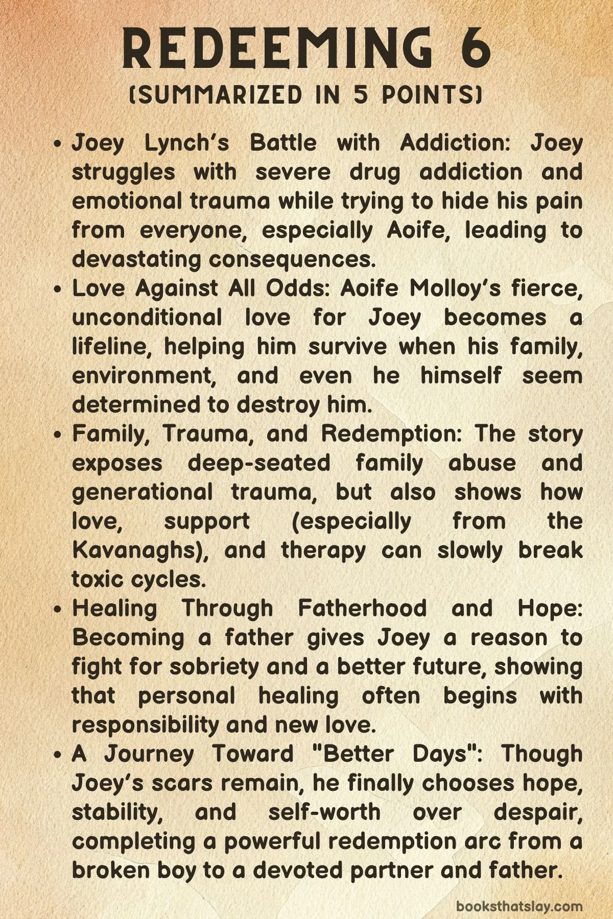 Redeeming 6 is a contemporary romance and coming-of-age novel by Chloe Walsh, set in the emotionally charged world of Ballylaggin and the wider Boys of Tommen series. At its center are Joey Lynch and Aoife Molloy, two young people deeply in love but carrying more pain than most adults could bear.