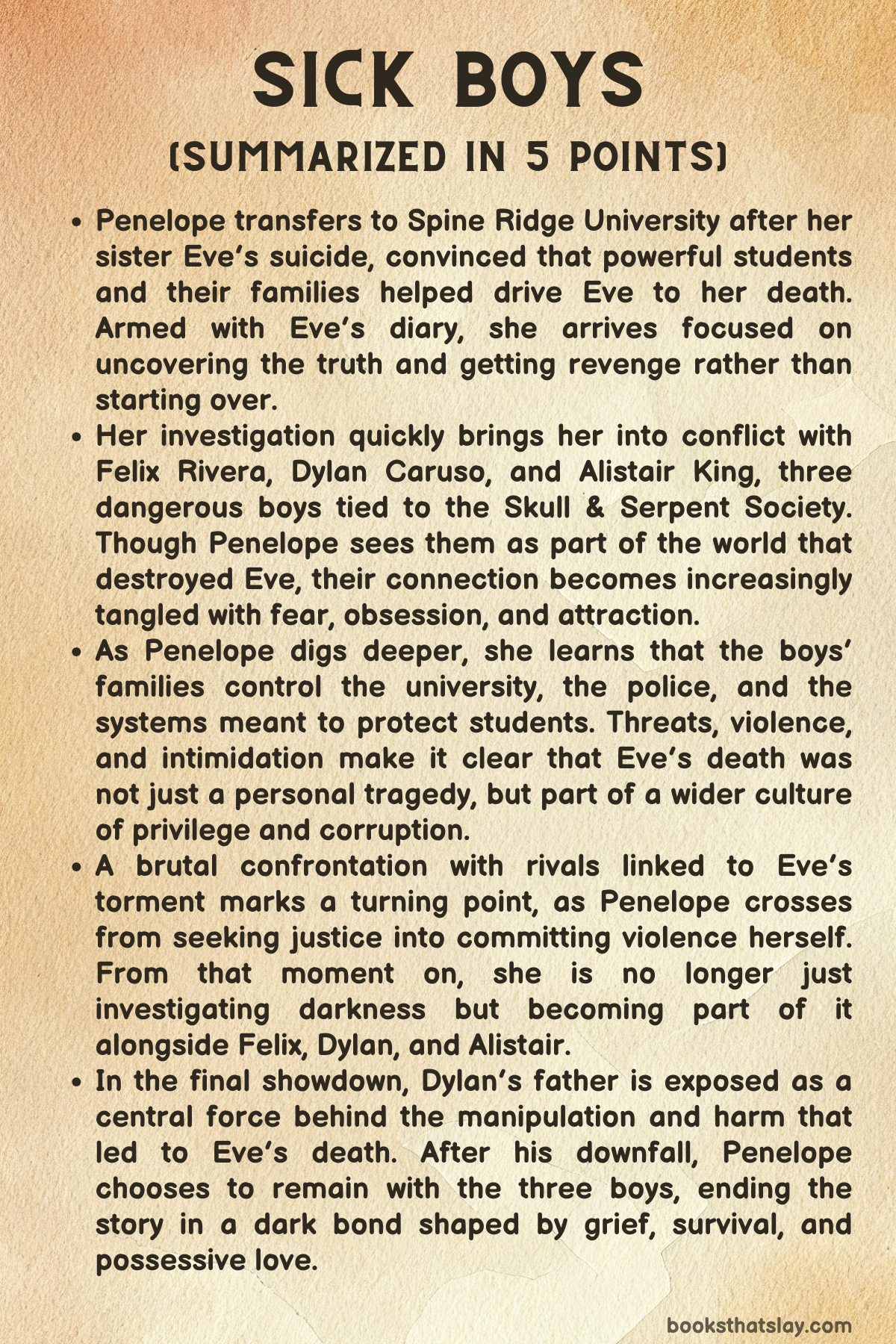 It follows Penelope as she transfers to Spine Ridge University after her sister Eve’s suicide, convinced that powerful students at the school helped drive Eve to her death. What begins as a search for answers turns into a dangerous bond with Felix Rivera, Dylan Caruso, and Alistair King, three feared boys tied to the Skull & Serpent Society. The book mixes grief, obsession, violence, and desire, building a story where Penelope is pulled deeper into the same world that destroyed her sister.