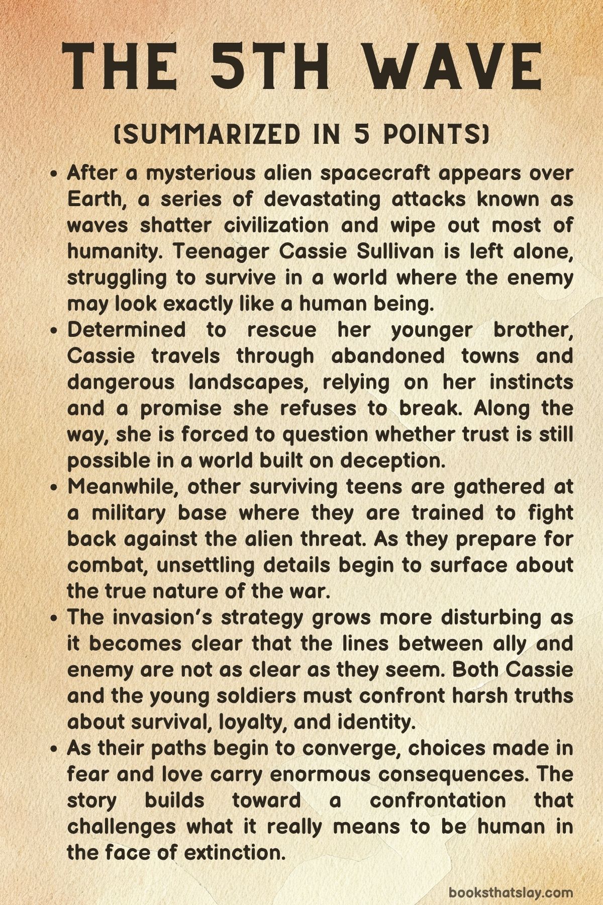 The 5th Wave by Rick Yancey is a young adult science fiction novel set in a world shattered by an alien invasion. The story follows Cassie Sullivan, a teenage girl trying to survive after a series of devastating attacks—called waves—nearly wipe out humanity.