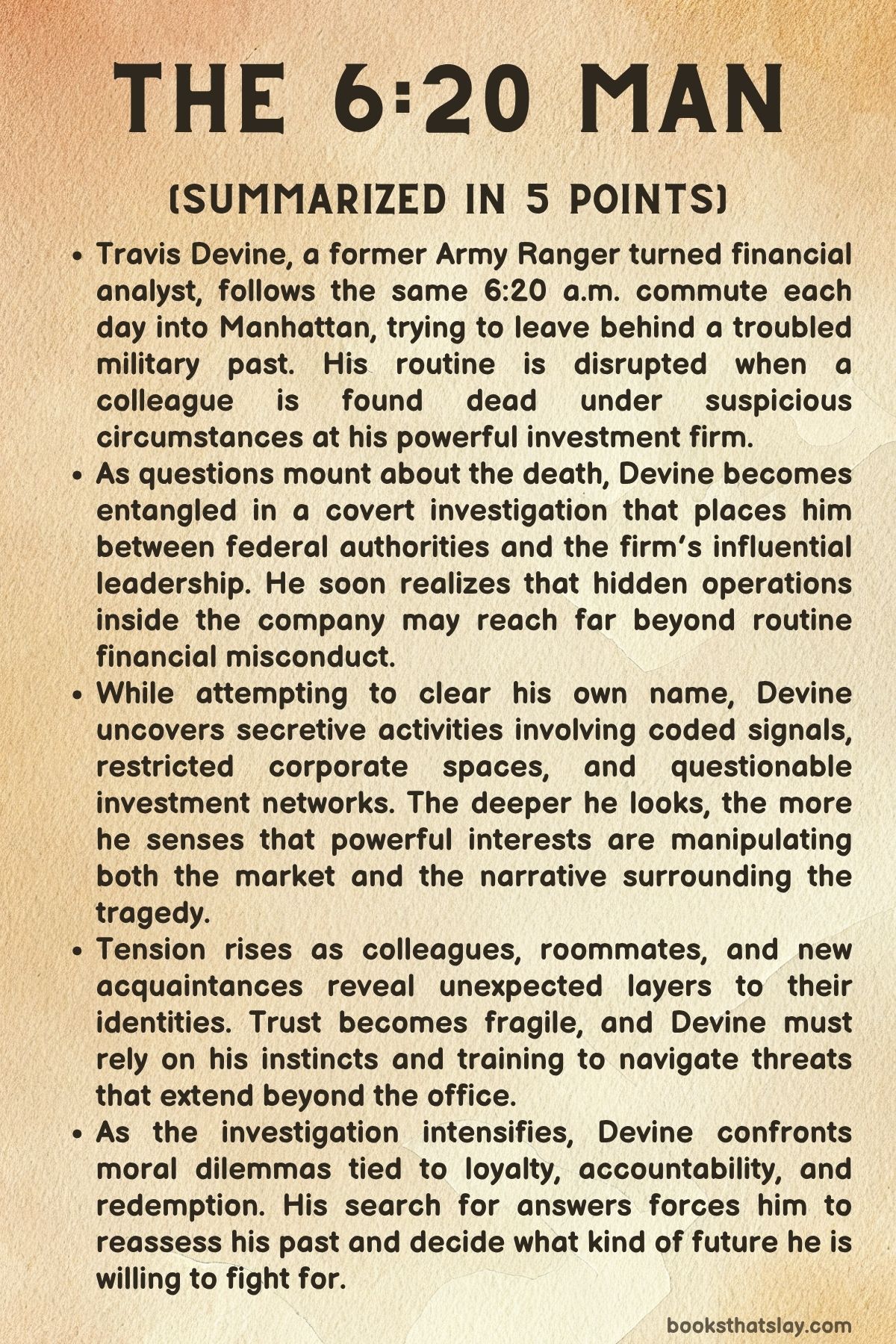 The 6:20 Man by David Baldacci is a contemporary thriller that blends high finance, political corruption, and personal redemption. At its center is Travis Devine, a former Army Ranger who now works as a junior analyst at a powerful Manhattan investment firm.