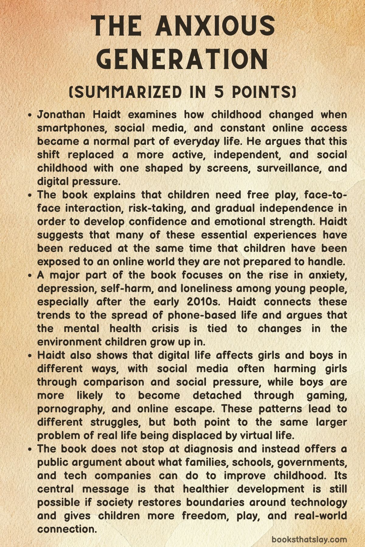 The Anxious Generation: How the Great Rewiring of Childhood Caused an Epidemic of Mental Illness is Jonathan Haidt’s argument that childhood has been radically altered by the rise of smartphones, social media, and an overly protective culture in the physical world. He says young people lost the freedom, play, and face-to-face contact that earlier generations relied on to grow into capable adults.