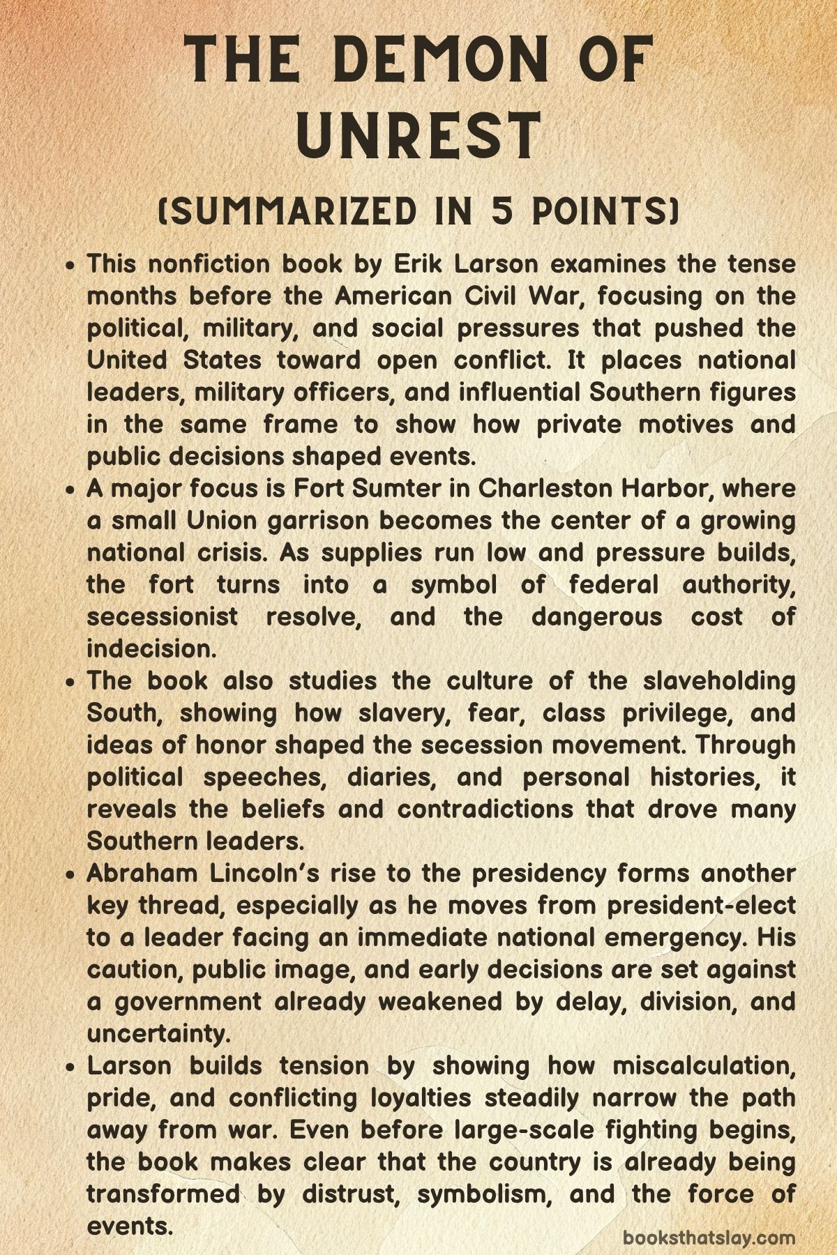 The Demon of Unrest: A Saga of Hubris, Heartbreak, and Heroism at the Dawn of the Civil War by Erik Larson is a nonfiction account of the tense months that led to the first shots of the American Civil War. Centering on Fort Sumter and the people drawn into its fate, the book shows how political miscalculation, personal pride, fear, and loyalty pushed the nation toward open conflict.