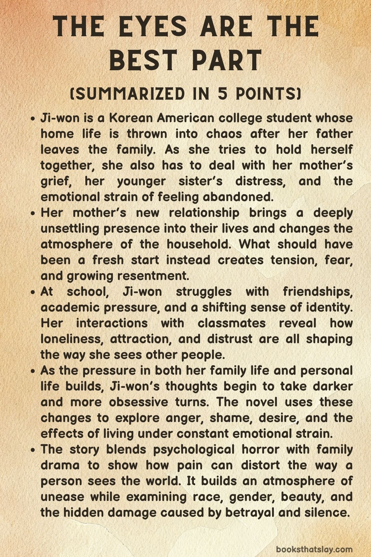 The Eyes Are the Best Part by Monika Kim is a dark psychological horror novel about a Korean American college student whose family begins to break apart after her father leaves home. At the center is Ji-won, a young woman trying to manage grief, anger, racism, academic pressure, and the growing threat posed by her mother’s new boyfriend.