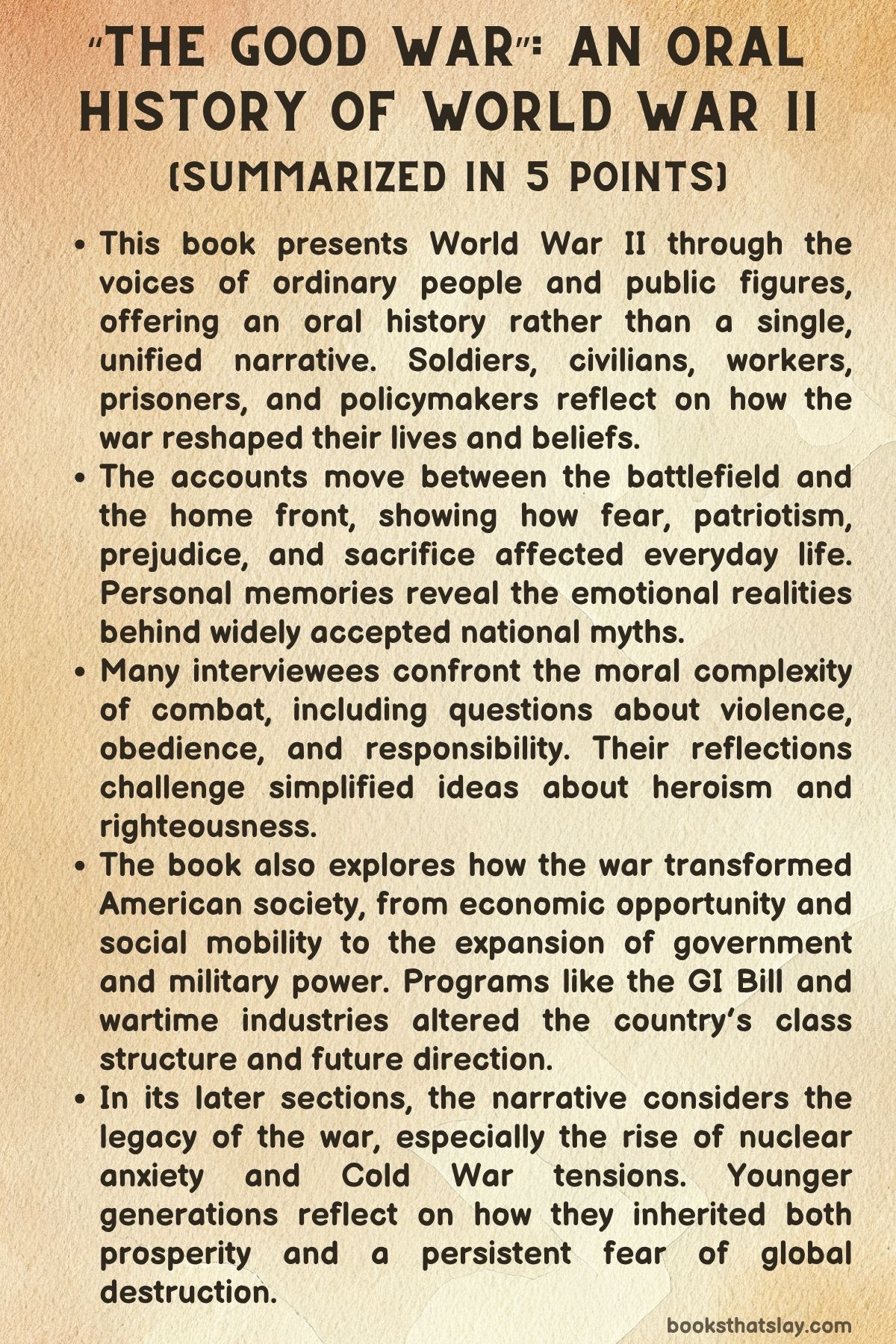 Yet many also insist that war itself deforms the human spirit, encourages cruelty, and leaves damage that no victory parade can erase. The “good war” label survives because it came with national unity and later prosperity, but the testimonies show a messier truth: fear and racism at home, brutality abroad, moral confusion at the top, and a postwar world shaped as much by nuclear anxiety and Cold War tension as by celebration.