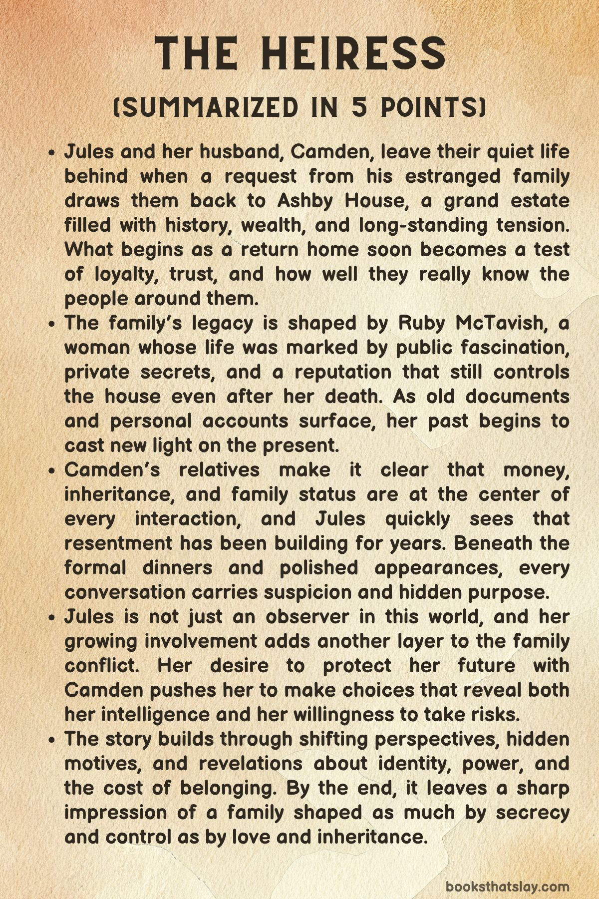 The Heiress by Rachel Hawkins is a dark domestic suspense novel about inheritance, family myth, hidden identity, and the damage left behind by power. The story begins when Camden McTavish returns with his wife, Jules, to Ashby House, the grand North Carolina estate he left behind years earlier.