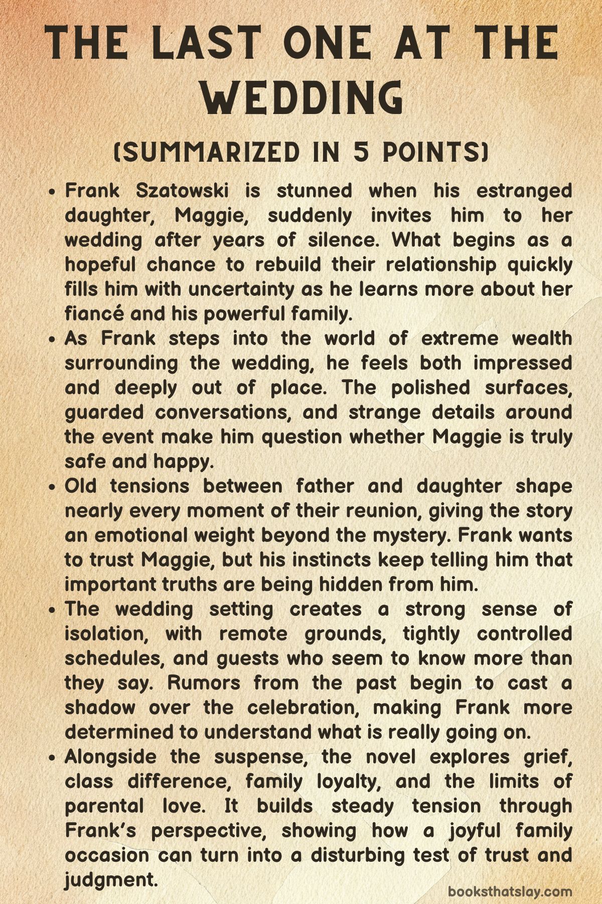 The Last One at the Wedding by Jason Rekulak is a suspense novel about family, class, power, and the painful gap between how well we think we know the people we love and who they really are. At its center is Frank Szatowski, a working-class father who is thrilled when his estranged daughter, Maggie, invites him to her wedding after years of silence.