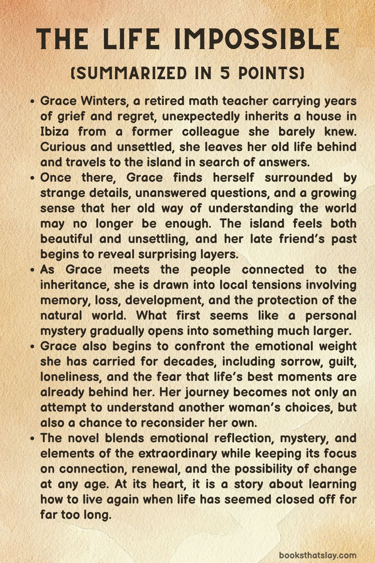 The Life Impossible by Matt Haig is a contemporary novel that blends grief, mystery, wonder, and late-life transformation. At its center is Grace Winters, a retired math teacher in her seventies who feels emotionally stranded after years of loss, guilt, and loneliness.