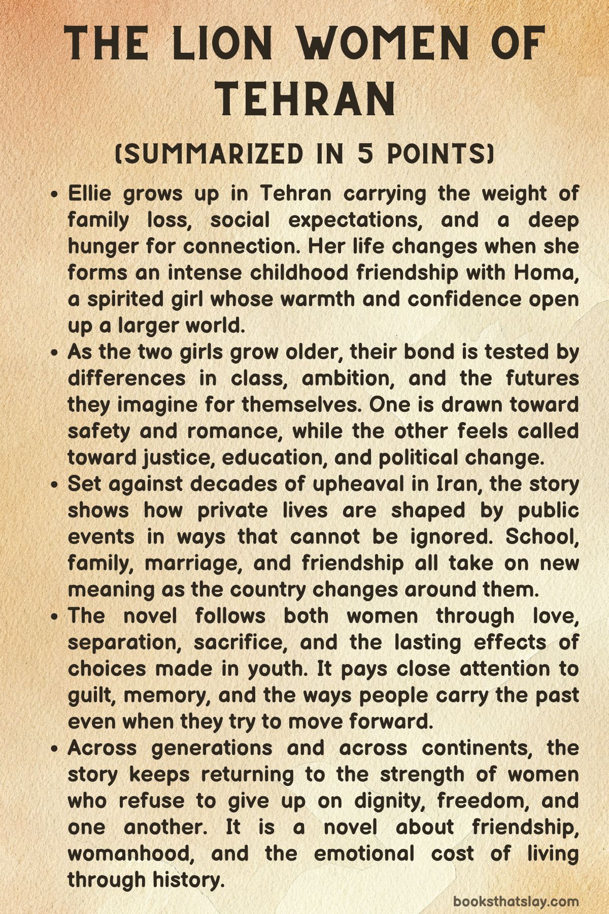 The Lion Women of Tehran by Marjan Kamali is a historical novel about friendship, class, guilt, love, and political change in modern Iran. At its center are two girls, Ellie and Homa, whose bond begins in childhood and is tested by ambition, privilege, betrayal, and history itself.